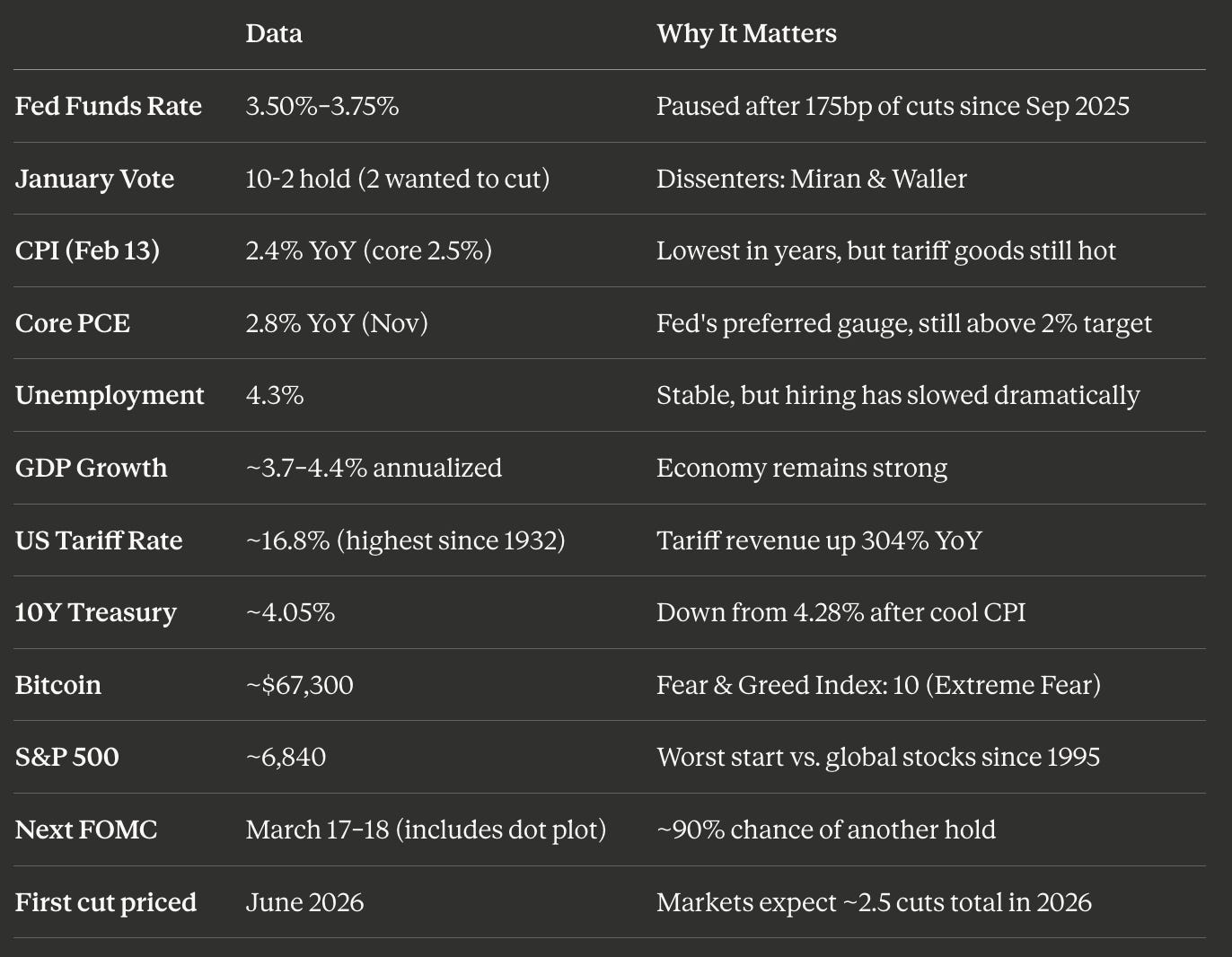 The Fed held rates at 3.50%–3.75% in January after three straight cuts. Today’s minutes reveal the debate behind the decision: how close we were to another cut, how worried they are about tariffs reigniting inflation, and whether mid-2026 cuts are still on the table. With Bitcoin at ~$67K in “Extreme Fear” and the S&P 500 under pressure, subtle word changes in this document can move billions. Here’s everything you need.