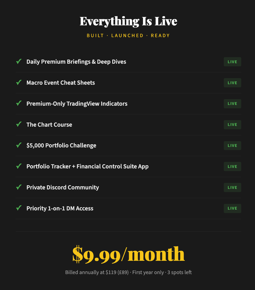 Everything I’ve been building over the last few months is now live. The Chart Course launched. The premium TradingView indicators are on charts. The private Discord is open. The portfolio tracker app is in members’ hands. The daily deep dives and cheat sheets are going out every morning.