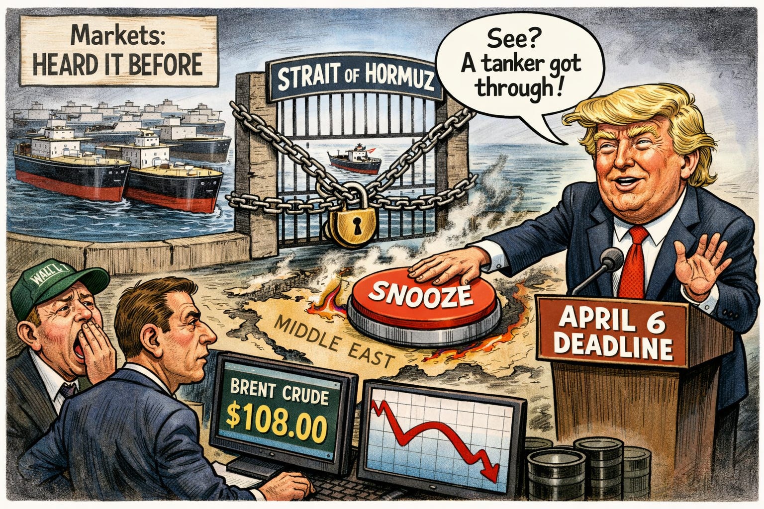The market’s reaction to the extension tells the real story. Two weeks ago, Trump’s first pause sent Brent crude down 11% and stocks surging. Today, S&P 500 futures are down 0.2% despite the announcement, with Brent still trading near yesterday’s close of $108.01 a barrel. Markets have seen enough of these extensions to stop pricing peace into asset prices. The S&P 500 is on track to close out its fifth consecutive losing week. Iran’s insistence on formal sovereignty over Hormuz is a non-starter for any deal the US could credibly accept, which means the gap between Trump’s public optimism and the actual state of negotiations may be wider than at any point since the war began (CNN).