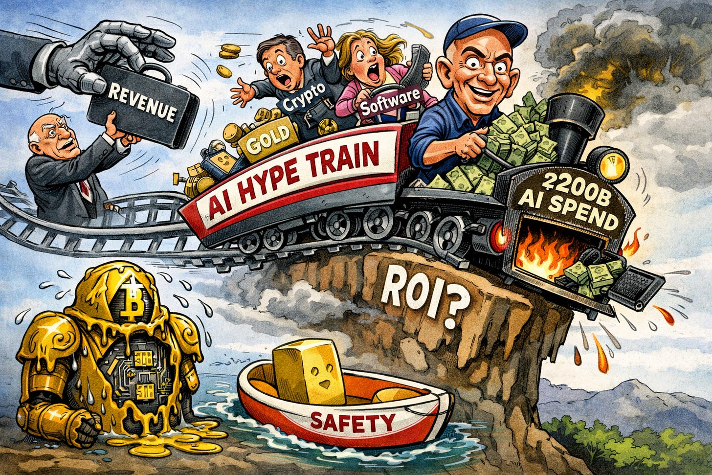 The multi-asset retreat we saw yesterday was a classic “get me out” moment as the market’s most popular bets, software, crypto, and precious metals, all buckled at once. The S&P 500 dropped 1.2%, but the real pain was under the hood. Software stocks faced a “SaaSpocalypse” triggered by Anthropic’s new AI tools, which investors fear could automate away the core revenue of traditional data and legal vendors. Bitcoin, once the post-election darling, plunged through the $70,000 floor to briefly touch $61,000, effectively wiping out 15 months of gains. The final blow came after-hours when Amazon revealed a $200 billion AI spending plan for 2026, causing its stock to crater 11% as shareholders balked at the massive price tag of the AI arms race (Bloomberg).