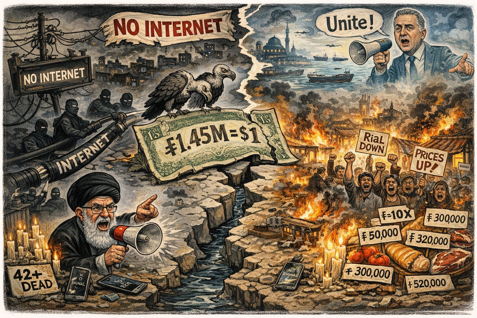🇮🇷 Iran blackouts follow rial collapse: The regime cut internet access as hyperinflation and currency devaluation triggered widespread national protests