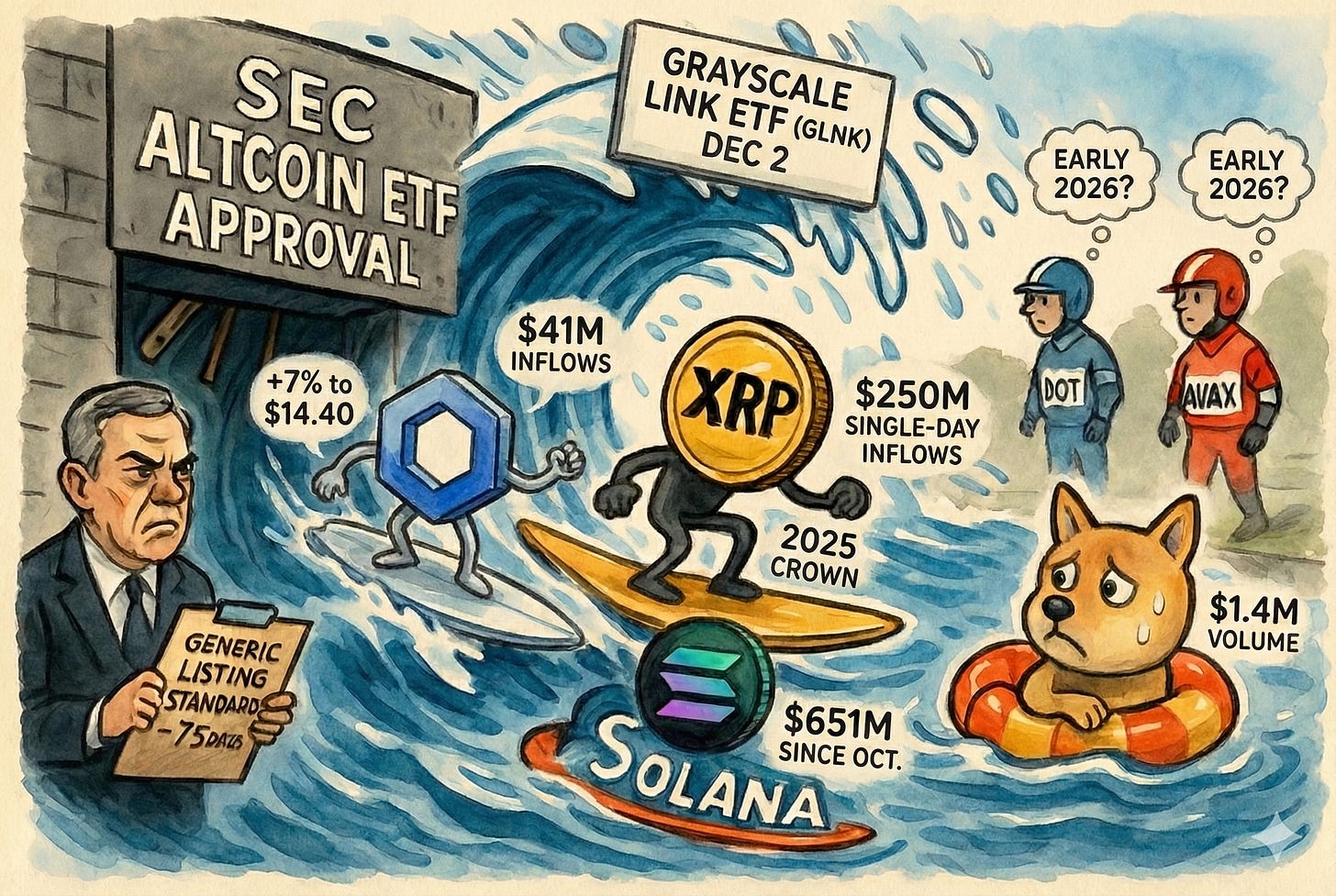 Grayscale launched its Chainlink ETF (GLNK) on December 2, pulling in a respectable $41 million in day-one inflows while LINK surged 7% to $14.40. However, the real story is the disparity in institutional appetite across these new products. Canary Capital’s XRP ETF (XRPC) still wears the 2025 crown, having smashed records with $250 million in single-day inflows on November 13. Contrast that with the utility-focused Bitwise Solana ETF (accumulating $651 million since October) versus Grayscale’s Dogecoin ETF, which landed with a thud ($1.4 million volume). Wall Street is clearly differentiating between infrastructure plays and meme coins.
