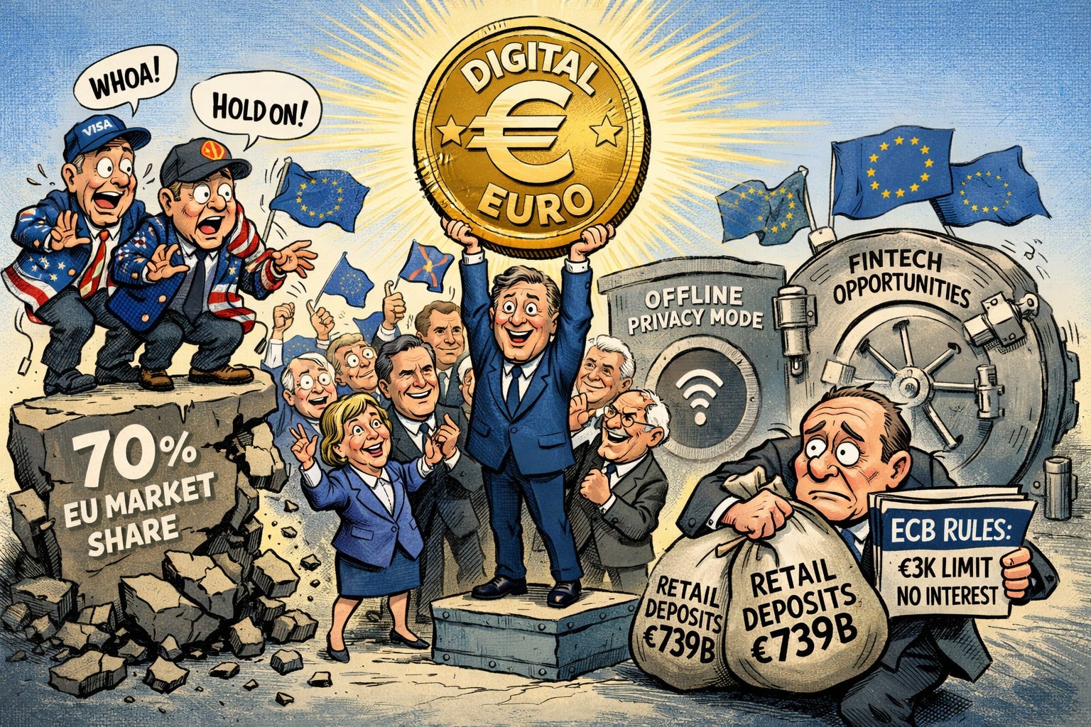 The move is a direct defensive play against the dominance of Visa and Mastercard, which control 70% of EU card payments, and the recent US push for dollar-denominated stablecoins. For retail investors, this signals a long-term structural shift. Payment processors may face valuation compression as their European oligopoly is challenged by a state-backed competitor with legal tender status. Meanwhile, eurozone banks face a dual-edged sword: they risk losing roughly €739 billion in cheap retail deposits to the ECB, yet they gain a new open platform to build fintech services without building their own payment rails. It’s a move toward “strategic autonomy” that could fundamentally reprice the European financial sector by the targeted 2029 launch.