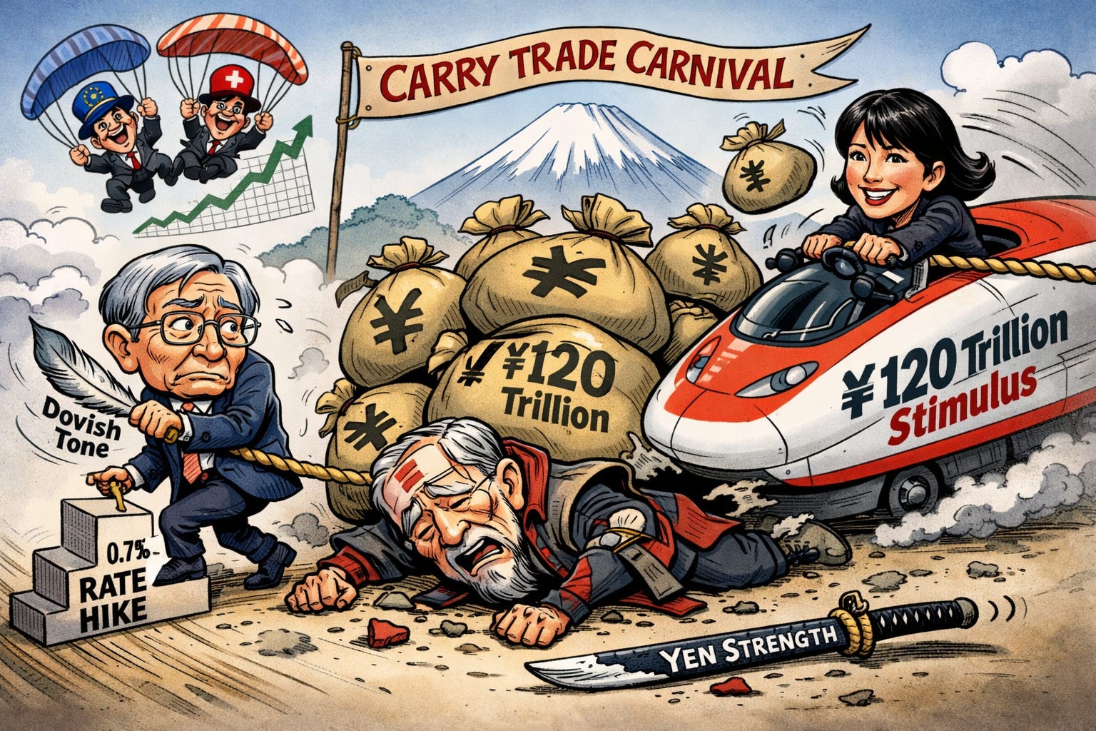 Sensei’s Insight: The “Widow Maker” trade is back. With Takaichi spending and Ueda hesitating, Japan’s policy friction is a green light for Yen shorts. Watch for a “flash crash” if Tokyo suddenly intervenes.