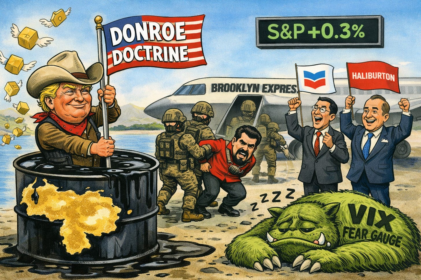Over the weekend, U.S. Delta Force units executed “Operation Absolute Resolve,” a surgical strike on Caracas that ended with Nicolás Maduro in a Brooklyn detention center. While the geopolitical shockwaves were historic, the market’s reaction was steady. S&P 500 futures rose 0.3% and Nasdaq-100 futures climbed 0.7%, while the VIX “fear gauge” sat at a sleepy 14.51. The Trump administration is framing this as the “Donroe Doctrine,” a pivot toward transactional resource extraction over long-term nation-building. Gold’s 2.3% jump to $4,430.99 represents a tactical hedge in an otherwise risk-on environment, showing investors are buying protection without fleeing the stock market (Bloomberg).