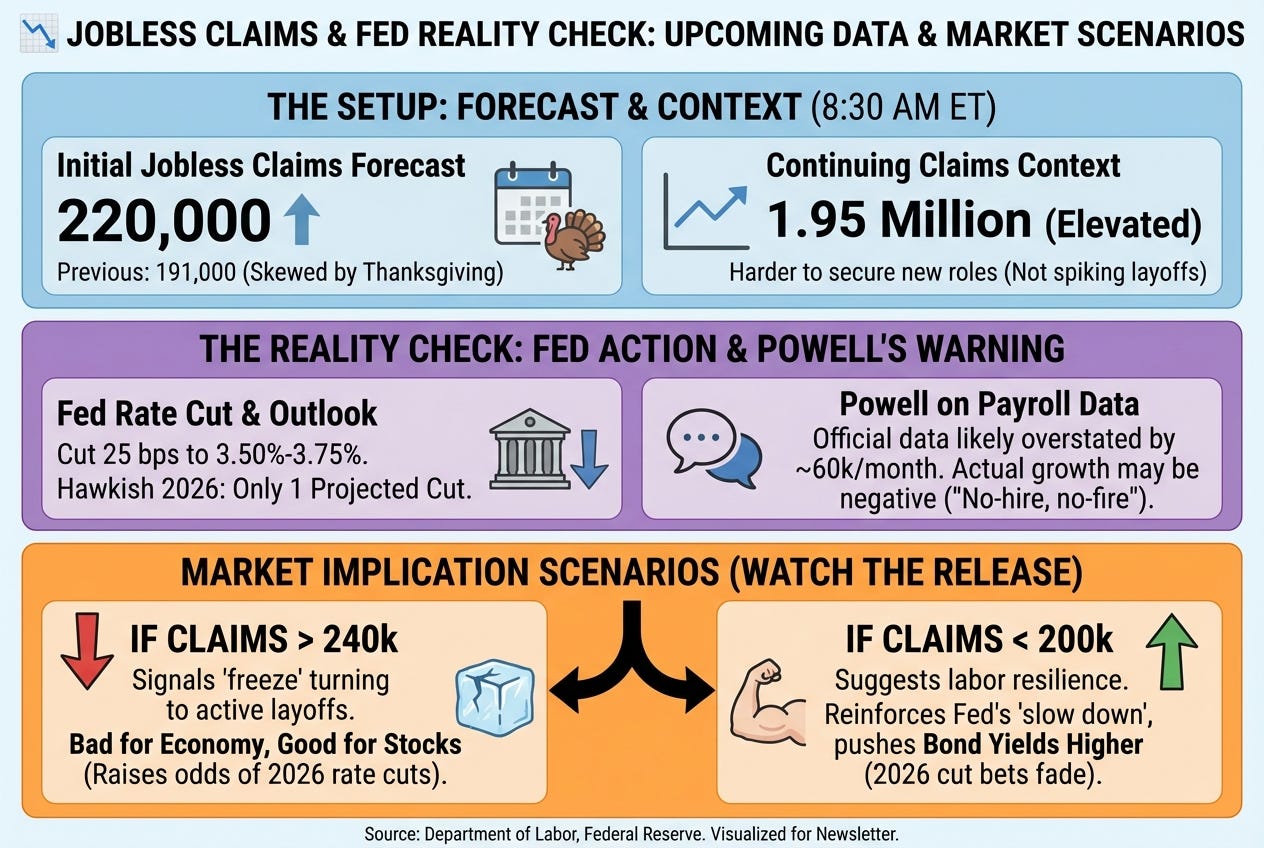 If Claims < 200k: Suggests labor resilience. Reinforces the Fed’s “slow down” message, likely pushing bond yields higher as 2026 rate cut bets fade.