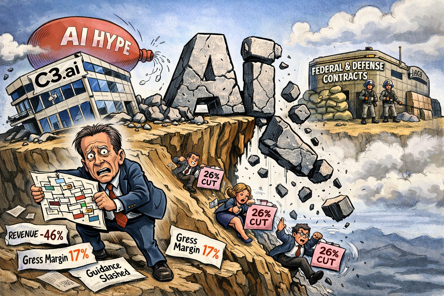 Alongside the results, C3.ai announced a sweeping restructuring. The company is cutting roughly 26% of its workforce, around 280 employees, and eliminating approximately $75 million in non-employee costs. The plan is expected to save $135 million annually, with full savings kicking in during the second half of fiscal 2027. Full-year revenue guidance was slashed nearly in half, from a range of $447.5 to $484.5 million down to $246.7 to $250.7 million. The one bright spot was federal and defence work, where bookings surged 134% year-over-year and accounted for 55% of total bookings. The company still holds $621.9 million in cash, giving it runway, but the quarter is a stark reminder that having “AI” in your name and ticker is no substitute for sustainable commercial execution (C3.ai Press Release).