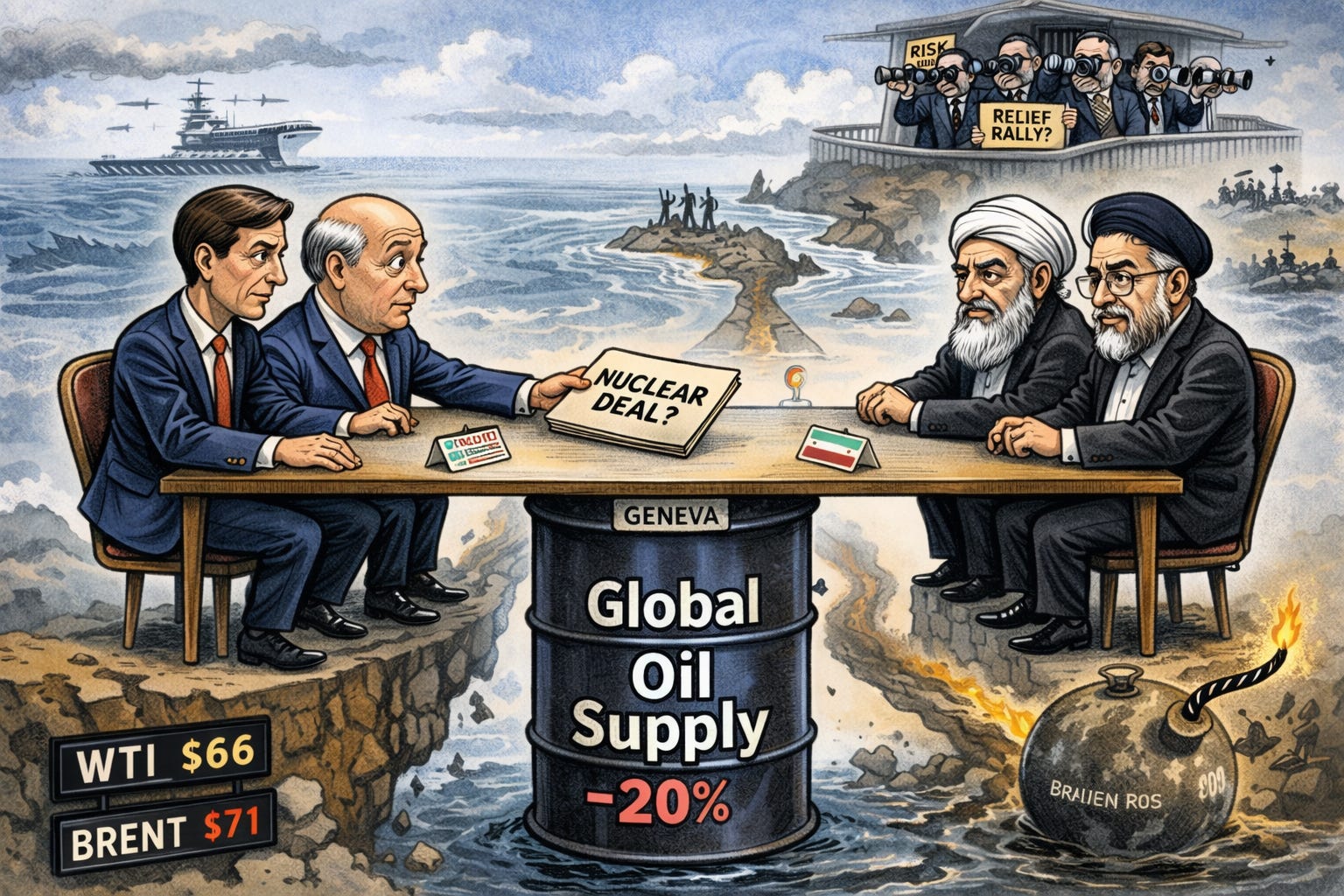 High-stakes nuclear negotiations between US and Iranian officials began in Geneva on Thursday. Trump envoys Steve Witkoff and Jared Kushner are leading the American delegation amid a visible US military build-up near Iran and warnings of potential escalation around the Strait of Hormuz, through which roughly 20% of global oil supply flows. West Texas Intermediate crude is trading near $66 per barrel, with Brent around $71 (Bloomberg).