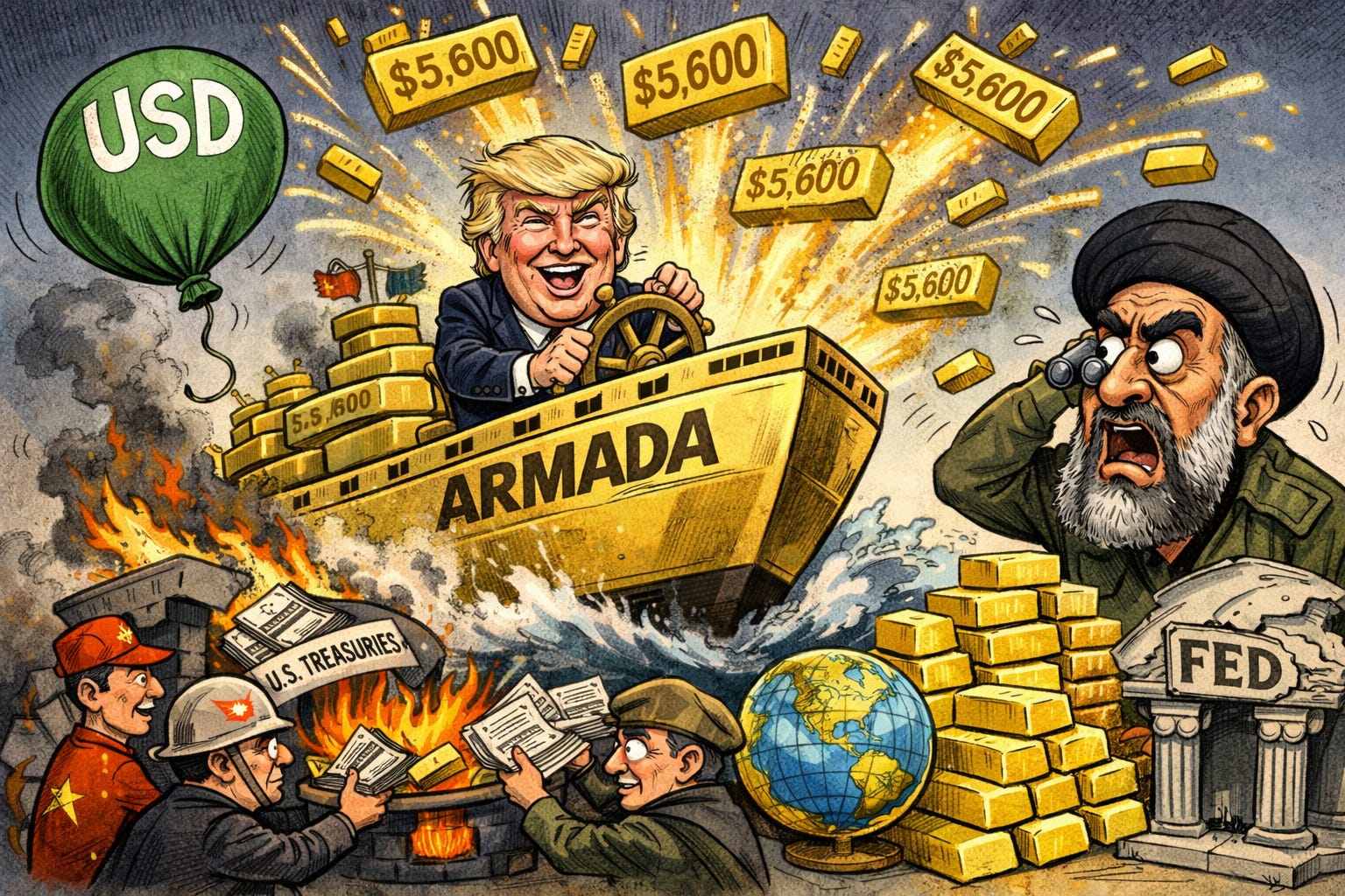 Gold reaches a record $5,600 per ounce following a $1,000 “flash” rally in ten days. Escalating Middle East tensions and a four-year low in the U.S. dollar drive the longest winning streak since 2024.