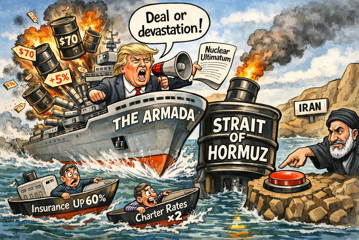 Oil markets just ripped through the $70 ceiling for the first time since September, with Brent crude climbing 2.7% to $70.26 today. This 5% rally since Monday is being fueled by President Trump’s escalating rhetoric. On Wednesday, he took to social media to warn Iran of a “massive Armada” en route to the Persian Gulf, demanding a nuclear deal or “devastating consequences.” This follows the 2025 “Operation Midnight Hammer” strikes on Iranian nuclear sites. While Iran says their fingers are on the trigger, the real fear is a bottleneck at the Strait of Hormuz, where 20% of global oil flows (Bloomberg).