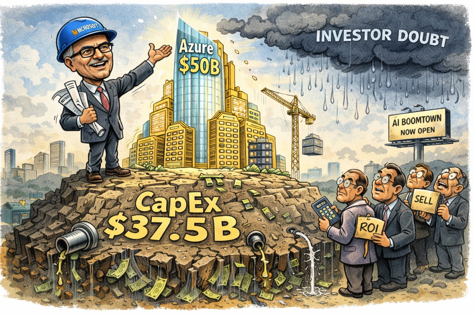 Microsoft just delivered a masterclass in operational excellence that the market promptly ignored. For Q2 FY26, the company posted a healthy beat with $4.14 in adjusted EPS and $81.27 billion in revenue, up 17%. The headline grabber should have been the cloud business crossing the $50 billion quarterly milestone for the first time, but a different number stole the show: $37.5 billion in capital expenditures. That is a 66% jump in spending year over year, significantly overshooting the $34.31 billion analysts expected. Even though Azure grew 39%, matching high expectations, the sheer scale of the bill to get there triggered a sharp selloff, with shares dropping as much as 7% in after-hours trading (Microsoft Investor Relations)