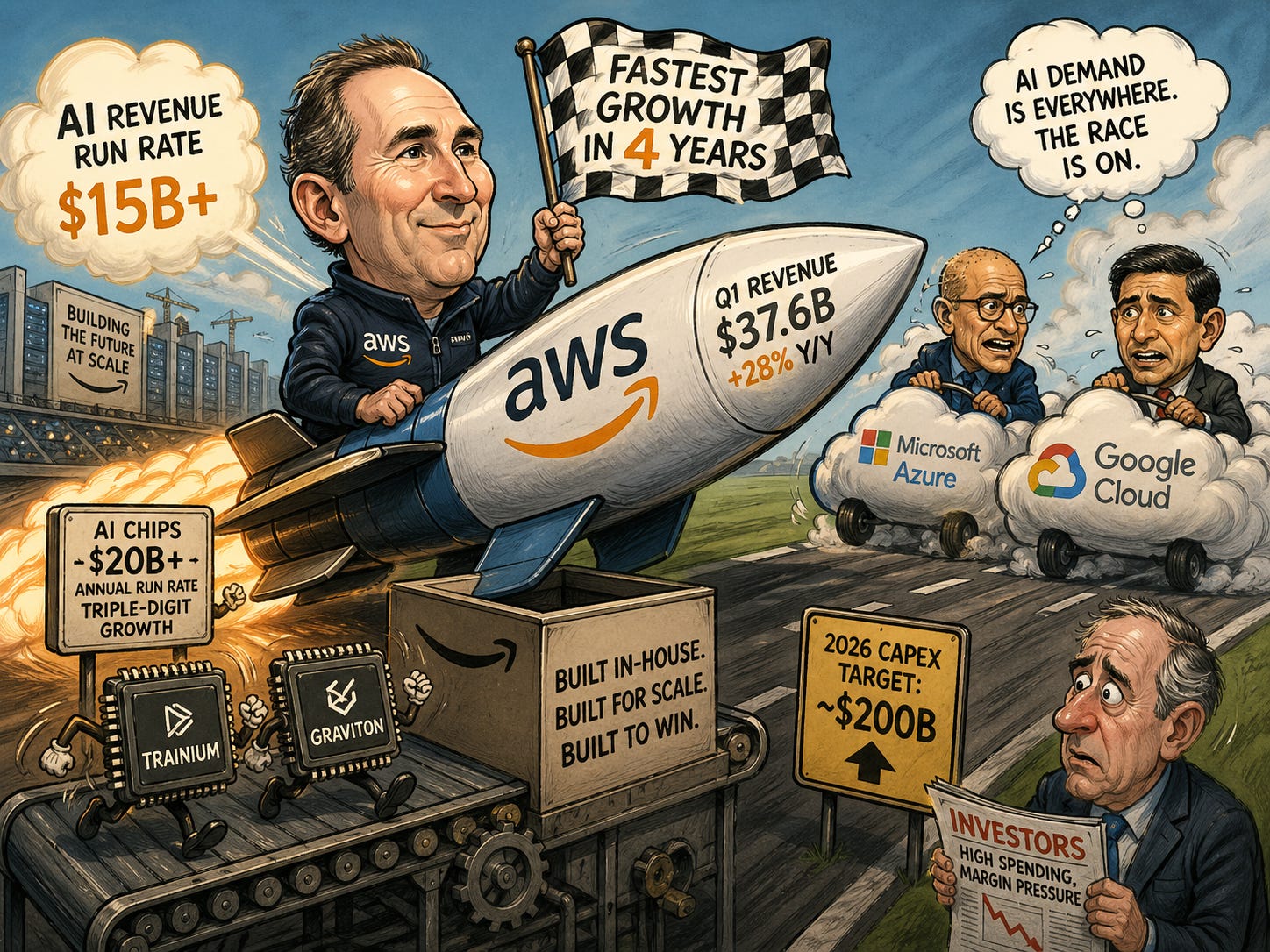 Amazon Web Services grew revenue 28% year over year to $37.6 billion in the first quarter, the fastest pace in 15 quarters and meaningfully ahead of the $36.6 billion analysts expected. Amazon’s total revenue rose 17% to $181.5 billion, and companywide operating income came in at $23.9 billion, well above the $20.8 billion consensus and above the top of the company’s own guidance range. Chief Executive Andy Jassy disclosed for the first time that AWS’s AI-related revenue had crossed a $15 billion annual run rate, and the company’s custom chips business, spanning the Trainium and Graviton processors, was growing at triple-digit rates on an annualized base above $20 billion. Separately, OpenAI committed to roughly 2 gigawatts of Amazon’s Trainium capacity starting in 2027, and Amazon said it would invest up to $25 billion more in Anthropic on top of the $8 billion already committed. (Amazon)