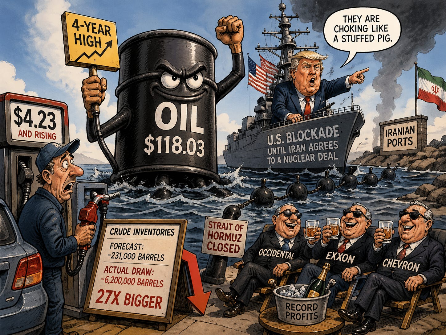 The market got something more significant than another supply-risk headline yesterday: confirmation that the US naval blockade of Iranian ports is no longer a temporary pressure tool but an open-ended condition. Trump told Axios the US would maintain it until Iran agreed to a nuclear deal, using language, “they are choking like a stuffed pig”, that ruled out any near-term off-ramp. Brent crude settled at $118.03 a barrel, up 6.1% and the highest close since June 2022, while West Texas Intermediate hit $106.88, up nearly 7%. The physical market confirmed what the price implied: the Energy Information Administration reported a 6.2 million barrel crude inventory draw, roughly 27 times the 231,000-barrel decline analysts had forecast, as record US exports of 6.44 million barrels per day helped drain domestic stockpiles. (CNBC)