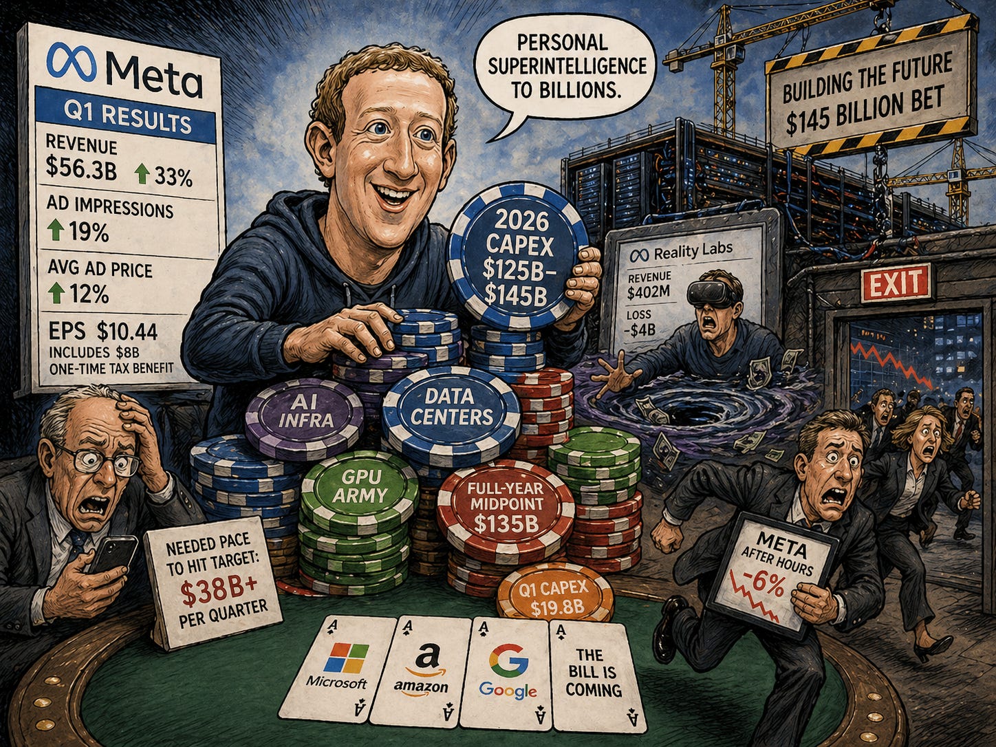 Meta’s first-quarter advertising business was by almost any measure excellent, but investors sold the stock roughly 6% after hours because the company raised its 2026 capital expenditure forecast by $10 billion at the midpoint, and then disclosed that actual Q1 spending came in far below the pace needed to hit the new target. Revenue rose 33% to $56.3 billion, beating consensus. Ad impressions rose 19% and average ad price climbed 12%, both improvements driven by AI-enhanced targeting tools including Advantage Plus. Diluted earnings per share were $10.44, though that figure included an $8 billion one-time tax benefit; on an adjusted basis the beat was more modest. The revised 2026 capex range of $125 billion to $145 billion, up from $115 billion to $135 billion, reflects what CFO Susan Li described as “higher component pricing”, the clearest public confirmation yet that AI chip costs are rising across the industry. (Meta Investor Relations)