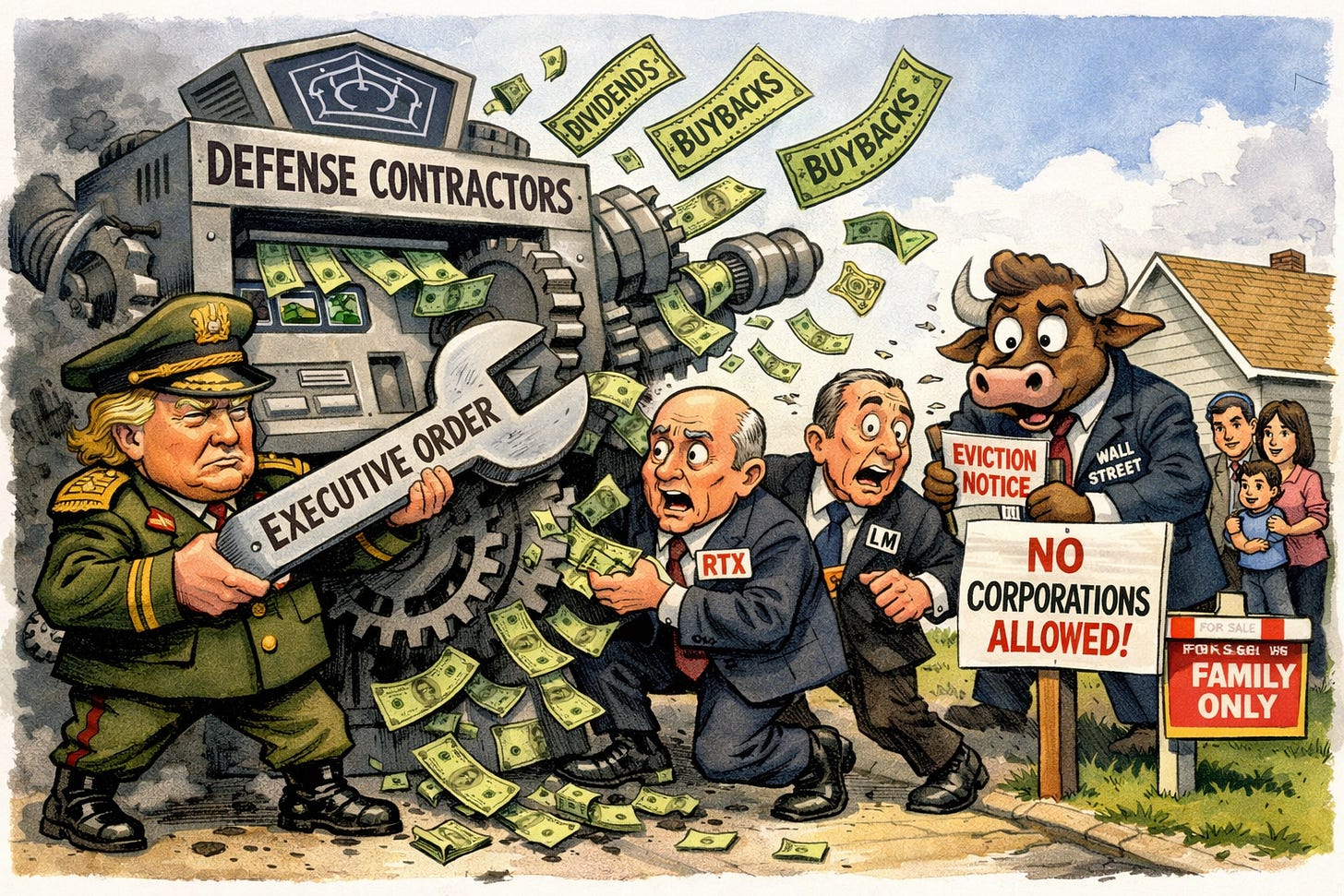 President Trump just threw a massive wrench into the machinery of both the defense industry and the housing market. On Wednesday, he signed an executive order that blocks defense contractors from paying dividends or engaging in stock buybacks if they fail to meet production speeds or prioritize government work. This targets a massive cash flow stream: the top four Pentagon contractors spent $89 billion on shareholders between 2021 and 2024, with nearly $58 billion of that coming from taxpayer funds. On the same day, Trump announced a push to ban large institutional investors from purchasing single-family homes, claiming that “people live in homes, not corporations.” (White House).