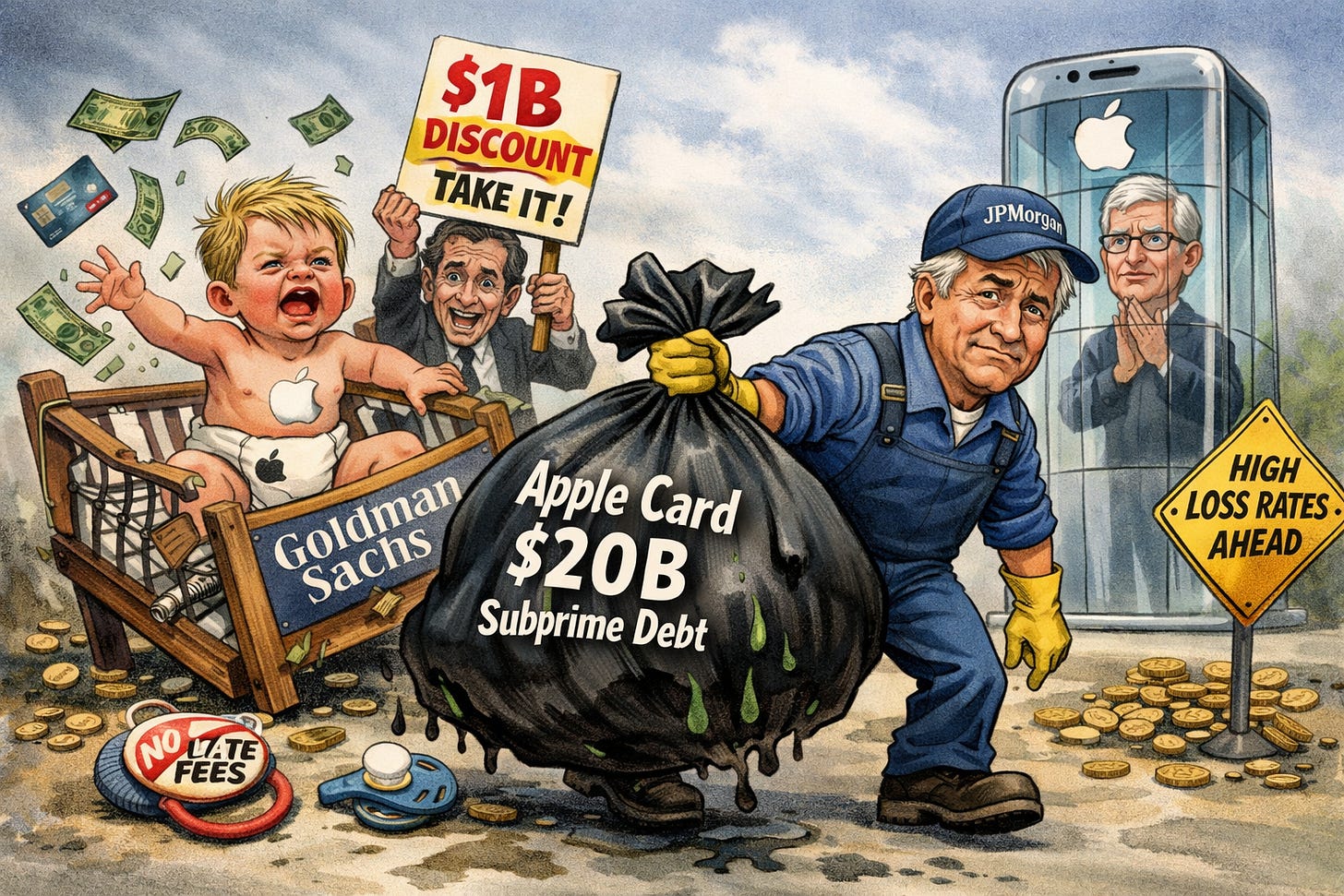 JPMorgan Chase just finalized a deal to rescue Apple’s credit card program from Goldman Sachs, taking on roughly $20 billion in outstanding balances. It’s a rare fire sale in the credit world: Goldman is offloading the portfolio at a discount of more than $1 billion. Usually, these co-branded deals command a premium, so this massive haircut highlights the toxic nature of the book. The move ends Goldman’s disastrous retail banking experiment, which racked up $7 billion in losses since 2020. The transition will take about 24 months, with Goldman continuing operations until the handoff is complete (WSJ).