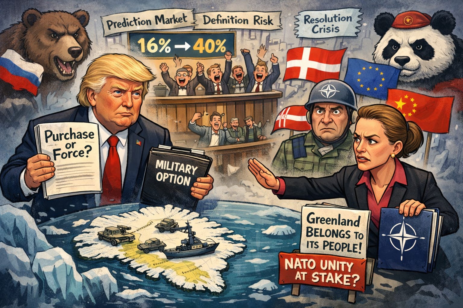 🇬🇱 Greenland purchase odds spike: White House officials suggest military options for acquisition, causing prediction market probabilities to jump.