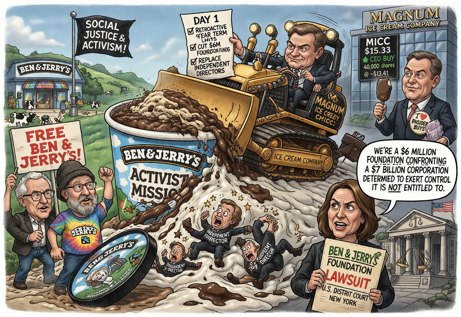 When Unilever bought Ben & Jerry’s for $326 million in 2000, the deal came with strings attached: an independent board would protect the brand’s activist identity, and at least 7.5% of annual profits would flow to the Ben & Jerry’s Foundation for social justice grants. Those protections survived for 25 years. Then Unilever spun off its entire ice cream business into a new publicly traded company called The Magnum Ice Cream Company (MICC) in December 2025, and within one week, Magnum moved to dismantle them. It retroactively imposed nine-year term limits to remove three independent board members, cut the Foundation’s roughly $6 million in annual funding, and by January 1, every independent director was gone. Yesterday a federal court in New York granted the Foundation permission to formally join the existing lawsuit filed by those ousted directors (Vermont Business Magazine).