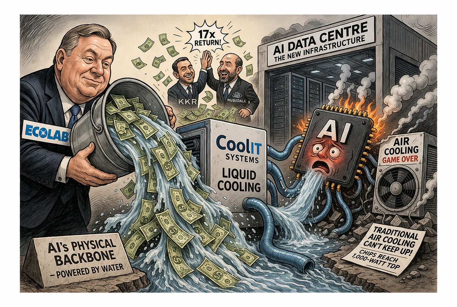 Ecolab, the century-old water treatment and hygiene giant, announced a $4.75 billion all-cash acquisition of CoolIT Systems, a Calgary-based data centre liquid cooling company currently owned by KKR and Mubadala. As artificial intelligence chips approach 1,000-watt thermal design power, traditional air cooling is failing, and liquid cooling is becoming mission-critical infrastructure. CoolIT designs and manufactures direct-to-chip cooling systems used by hyperscale operators including partnerships with Nvidia and AMD. The company is expected to generate approximately $550 million in sales over the next 12 months (Yahoo Finance).