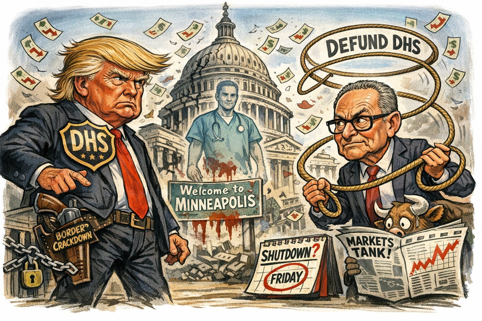 A potential government shutdown is looming as President Trump and Senate Democrats clash over Department of Homeland Security (DHS) funding. The flashpoint is the January 24 shooting of Alex Pretti, a 37-year-old ICU nurse and U.S. citizen, by Border Patrol agents during an immigration enforcement surge in Minneapolis. While DHS officials initially claimed Pretti was “violently resisting,” bystander video appears to show him being pepper-sprayed and pinned before being shot multiple times, including in the back. Senate Democratic Leader Chuck Schumer is now threatening to block all DHS funding unless the administration pulls federal agents out of Minnesota cities, creating a high-stakes standoff just weeks after the record-long 43-day shutdown ended in November (Bloomberg).