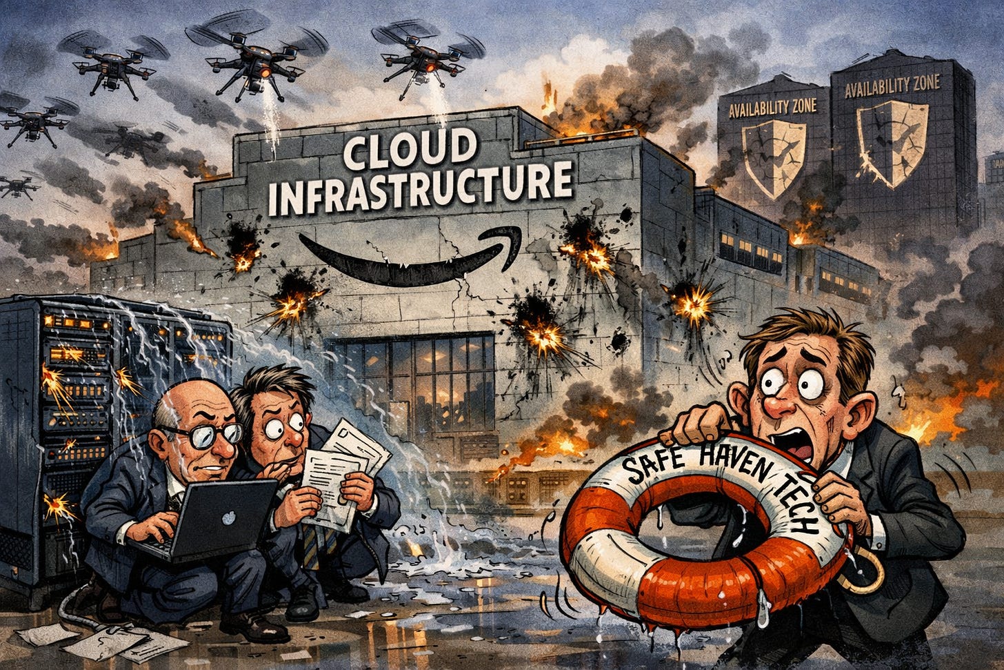 AWS was designed to withstand the failure of a single availability zone at a time. Losing two simultaneously overwhelms that redundancy entirely. Twelve or more core AWS services reported elevated error rates, and several major UAE banks including Emirates NBD and Abu Dhabi Commercial Bank reported temporary outages to mobile apps and phone services. AWS has formally advised customers with workloads in the region to back up data immediately and consider migrate to servers outside the Middle East. The wider investment implication is significant: Microsoft has committed $15 billion to UAE technology infrastructure through 2029, and Amazon, Google, and others have comparably large footprints in the Gulf. The question those companies now face is whether a data centre worth billions can be rendered inoperable by a drone costing a fraction of that (The Register).
