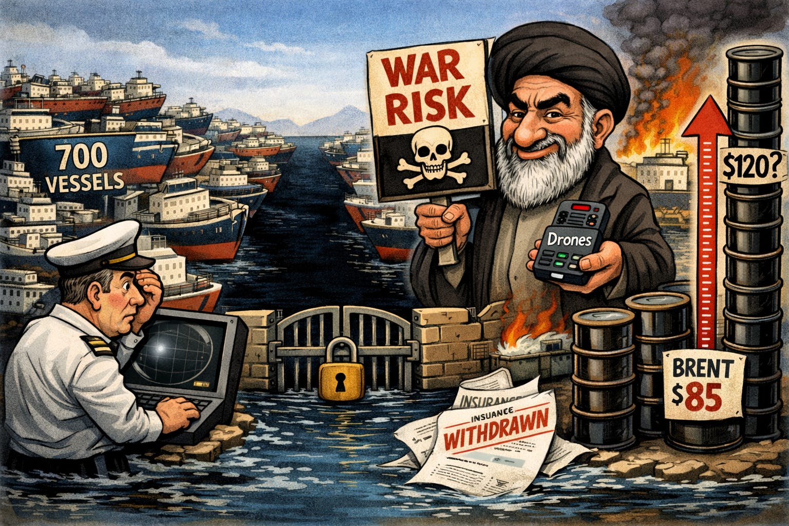 The Strait of Hormuz, a roughly 33-kilometre-wide channel between Iran and Oman through which approximately 20% of the world’s daily oil supply travels, has effectively shut down for commercial shipping. Iran didn’t need to deploy a naval blockade to achieve this. A combination of IRGC warnings, selective drone strikes on vessels, and the near-total withdrawal of war-risk insurance by major marine associations has been enough. Ship-tracking data shows tanker traffic dropped around 70% within the first day of the conflict and has since fallen to near zero, with no vessels currently broadcasting location signals in the strait. Brent crude has risen from roughly $73 a barrel before Saturday’s strikes to above $85 today, a move of over 16% in four days (CNBC).