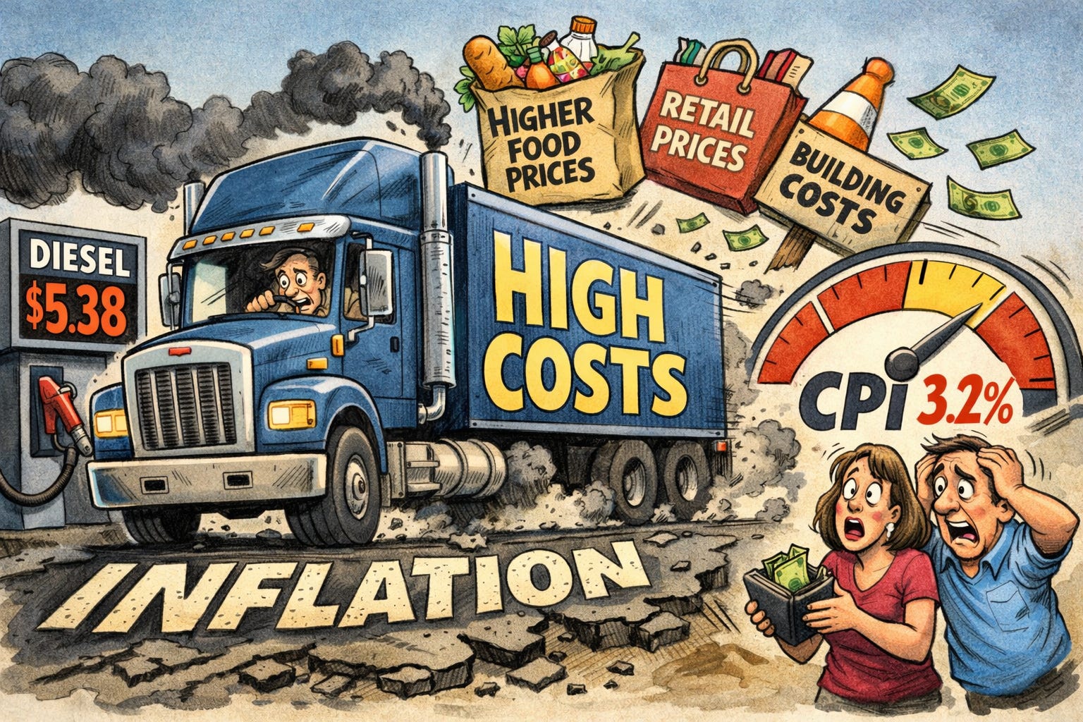🚛 US Trucking Rates Hit 2022 Highs: Diesel spikes drive freight surcharges to three-year peaks, feeding directly into upcoming CPI prints.
