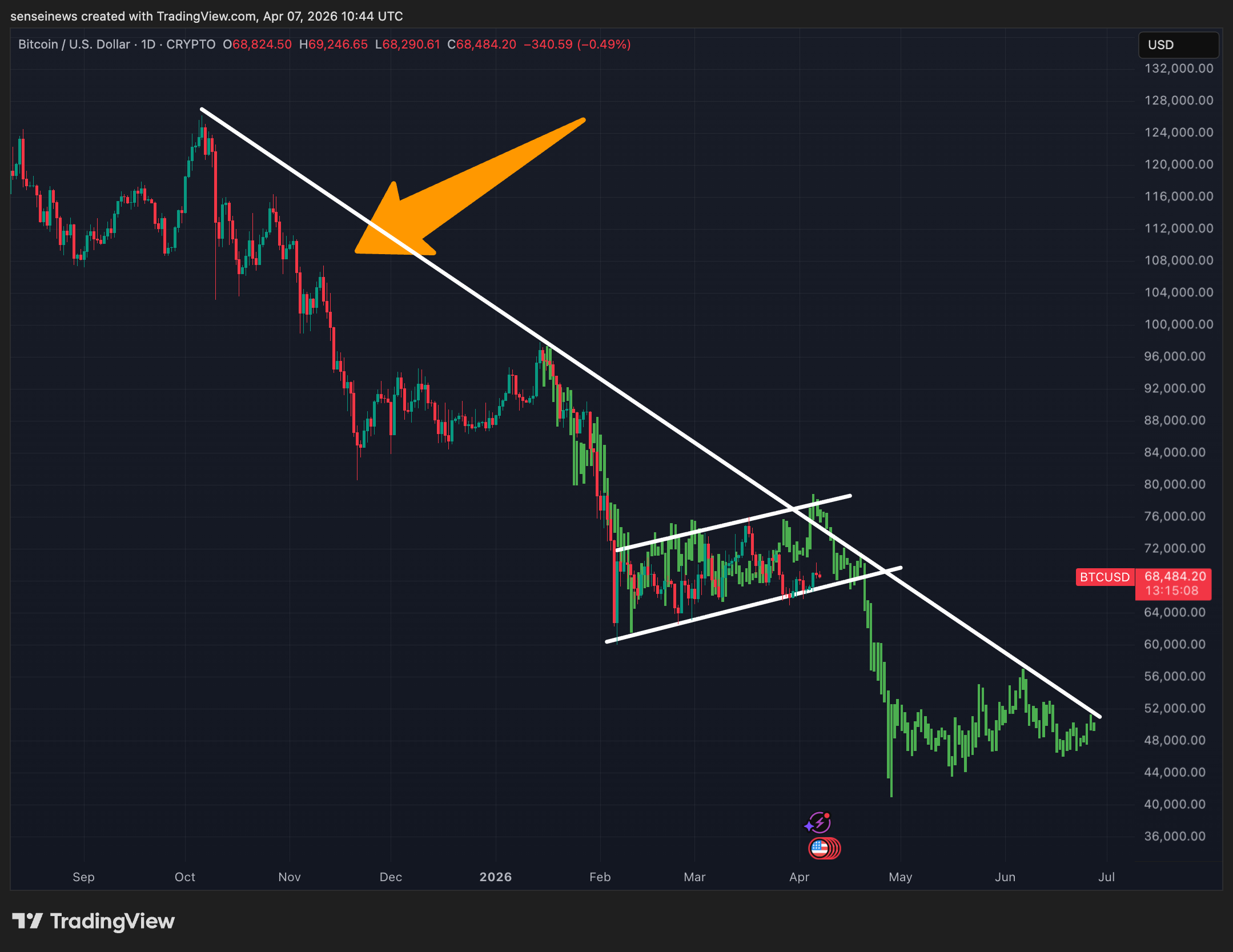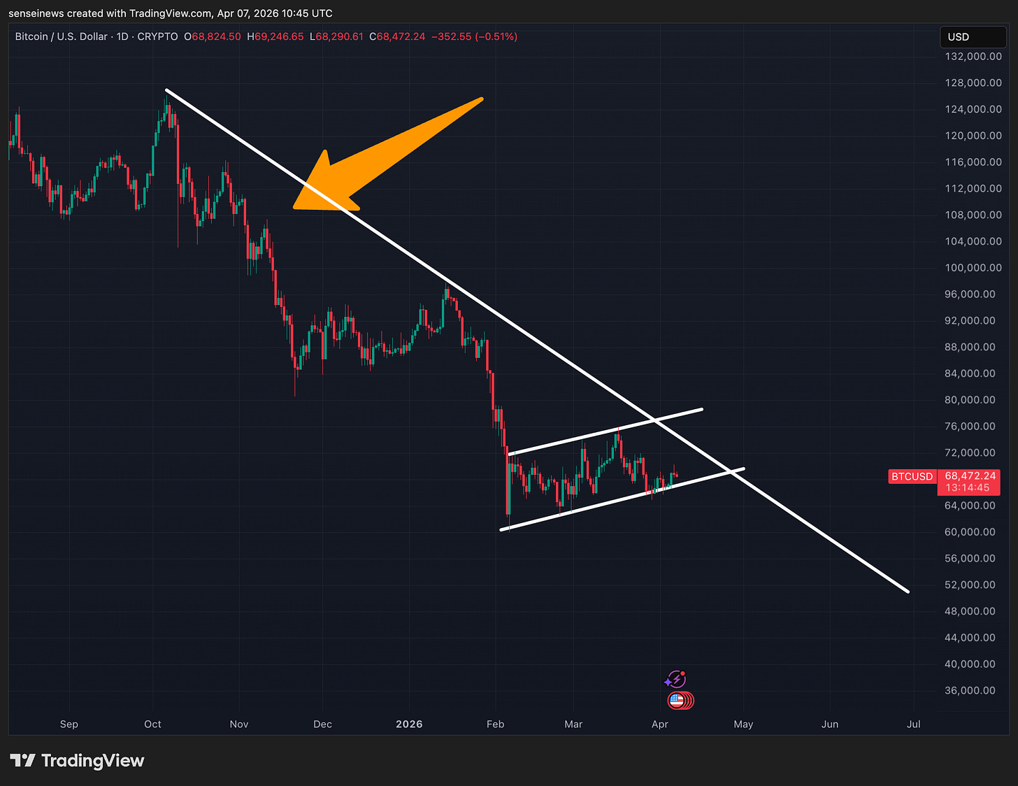 Taking a step back and looking at Bitcoin over the last year, we’re staring at a strong downtrend from the September 2025 highs near $128,000 all the way down to where we are now at $68,484. What stands out here is the potential for a repeat of the pattern we already saw play out between October 2025 and February 2026. That sequence was clear: downtrend, bear flag, then another leg down. Right now, price is consolidating in what looks like another bear flag forming inside that same descending trendline, and the structure is strikingly similar.