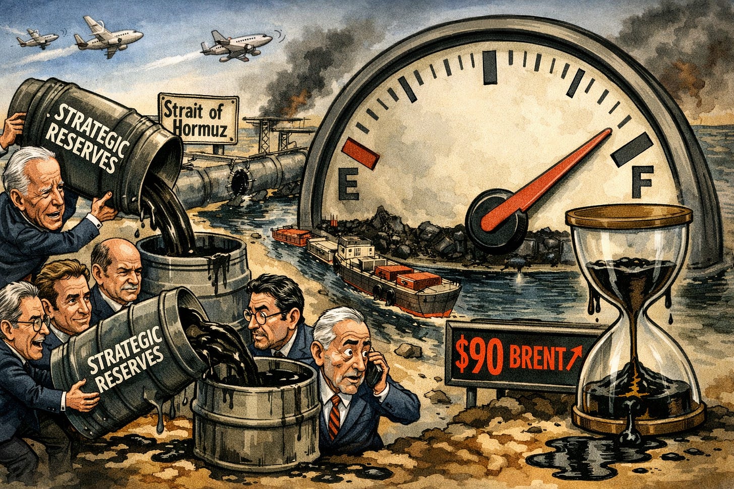 Sensei’s Insight: The market pricing Brent higher even as the largest reserve release in history is announced tells you exactly how tight this supply situation is. Governments are deploying their biggest emergency tool and it is not enough to push prices down. Watch whether the decision clears today - a single IEA member objection can delay it - and watch Brent’s reaction. If prices hold above $85 post-announcement, the market is telling you reserves alone cannot solve a Hormuz closure.