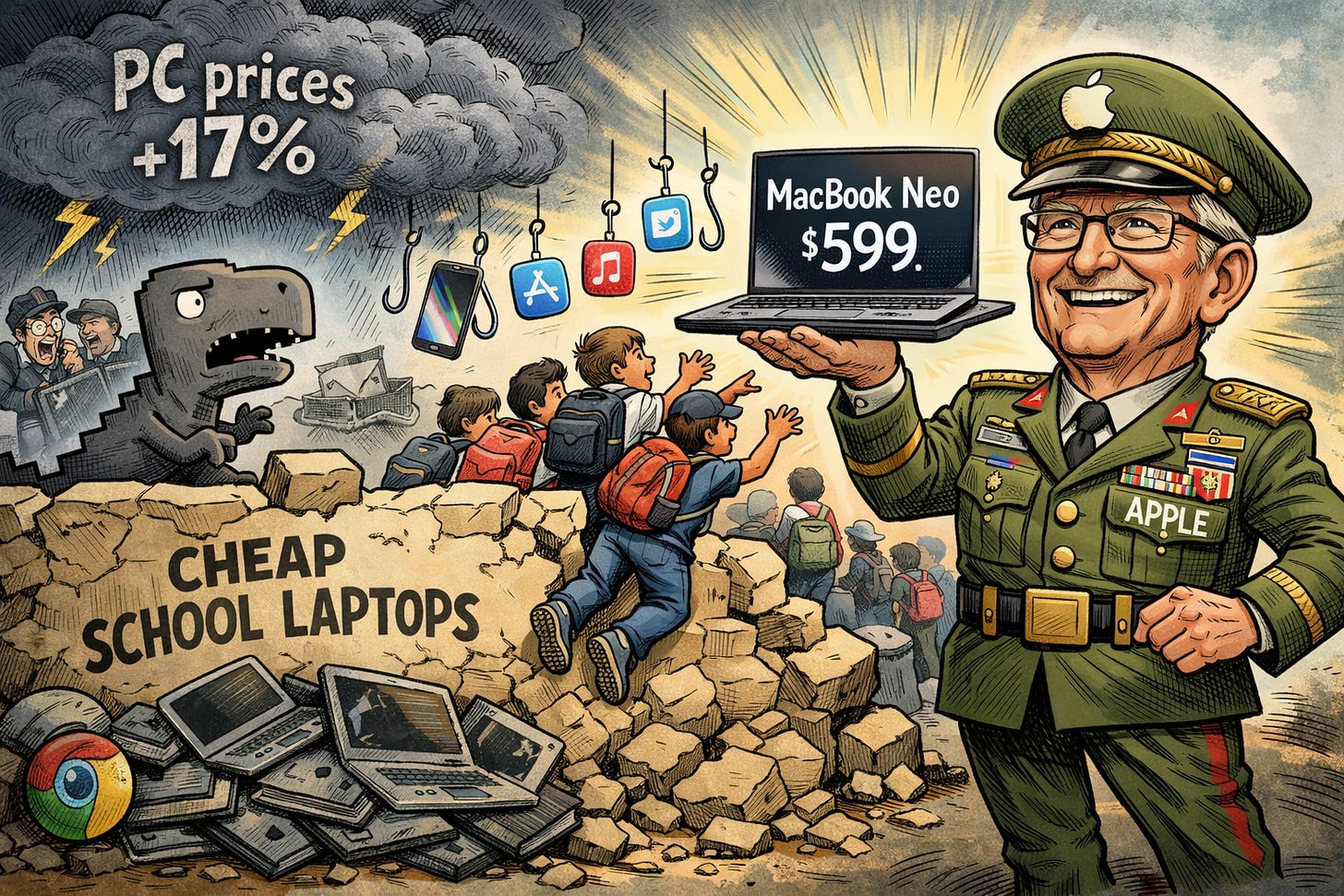 Sensei’s Insight: Google built its education dominance on one proposition: Chromebooks are cheap, simple, and good enough. At $499 with Apple silicon, the Neo removes “cheap” as a differentiator and erases “good enough” entirely. Chromebook penetration in US schools runs above 60%. If Apple converts even a fraction of that installed base, the downstream iPhone and services pull-through could be worth multiples of the Mac revenue itself.