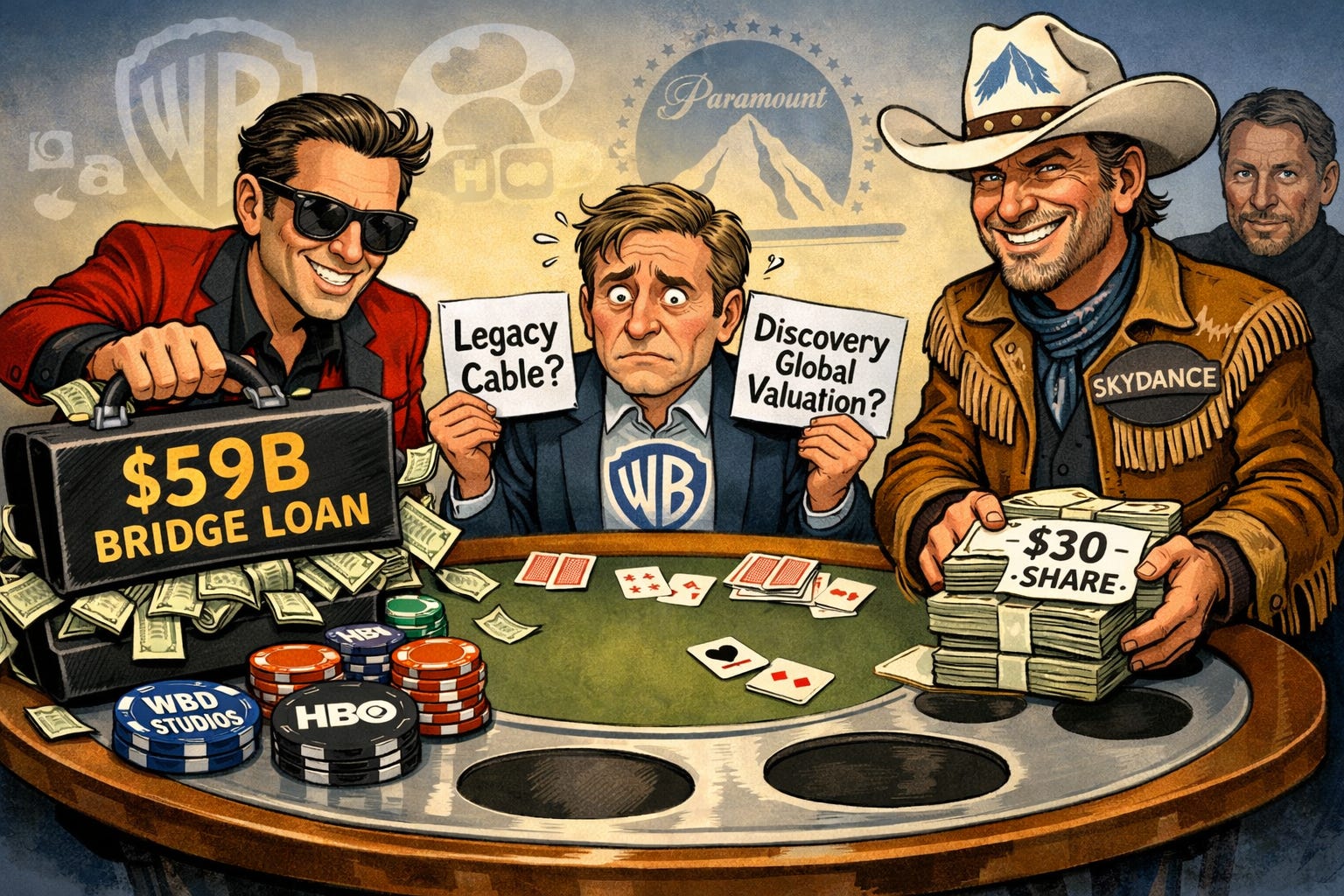 Netflix is pivoting its $82.7 billion pursuit of Warner Bros. Discovery, ditching the stock portion for a straight all-cash offer. It’s offering $27.75 per share, matching the previous total value but removing the volatility of Netflix’s own equity. This move comes just as Paramount Skydance pushes a hostile $30 per share all-cash bid, backed personally by Larry Ellison. Netflix is leaning on a massive $59 billion bridge loan to fund the acquisition of WBD’s studios and streaming units, while leaving legacy cable networks like CNN to be spun off into a new company (Bloomberg).