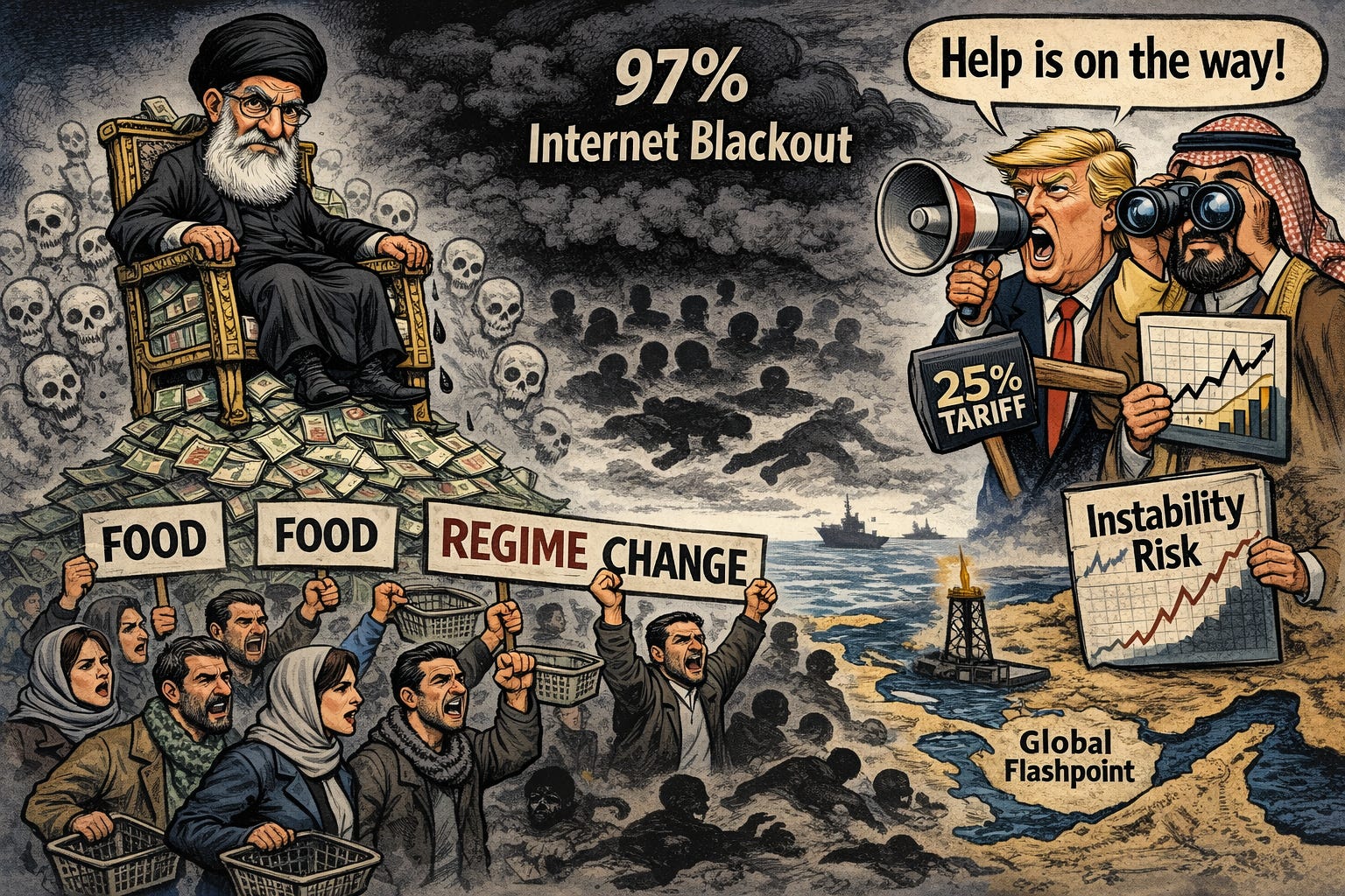 Iran is reeling from a systemic currency collapse that turned a food-price crisis into a nationwide uprising. On December 28, the rial hit a record low of 1.42 million to the US dollar, marking an 84% decline over the last year. This triggered 72% food inflation, forcing people into the streets. By January 8, demands shifted from economic relief to regime change, meeting a brutal government response. While human rights groups have verified 2,571 deaths, the real toll may exceed 12,000 as a 97% nationwide internet blackout conceals the scale of the crackdown (Bloomberg).