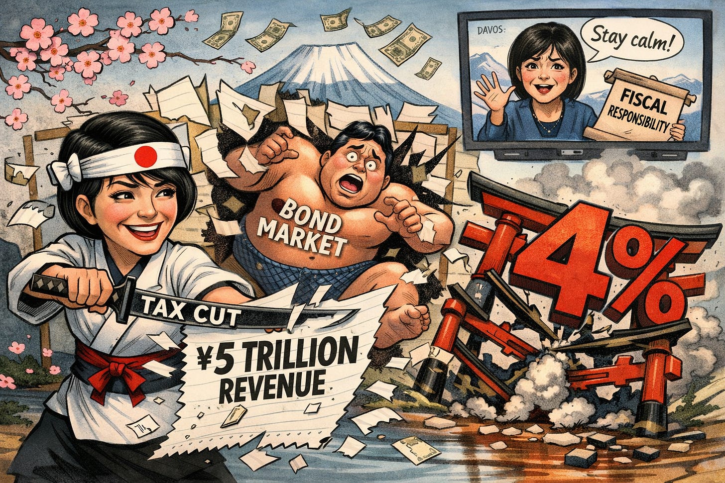 Prime Minister Sanae Takaichi just set off a firestorm in the Japanese government bond market. After calling a snap election for February 8, she pledged to suspend the 8% consumption tax on food for two years. This move, which would wipe roughly 5 trillion yen from annual revenue, sent investors sprinting for the exits. On Tuesday, the 40-year JGB yield pierced 4% for the first time since its 2007 debut, marking the highest level for any Japanese sovereign maturity in over 30 years. Global yields followed suit, with US 10-year Treasuries climbing toward 4.29% on contagion fears (Bloomberg).