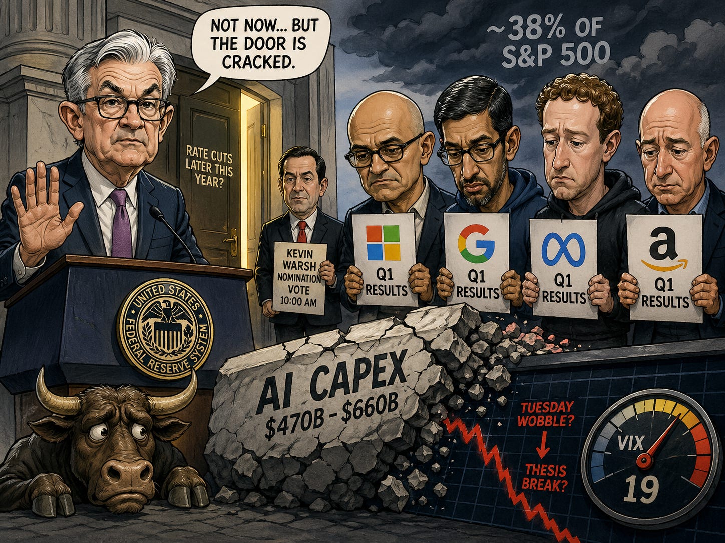 🏛️ Powell Exits, Mag 7 Reports: Federal Reserve announcement collides with hyperscaler capex guides that could break the artificial intelligence thesis.
