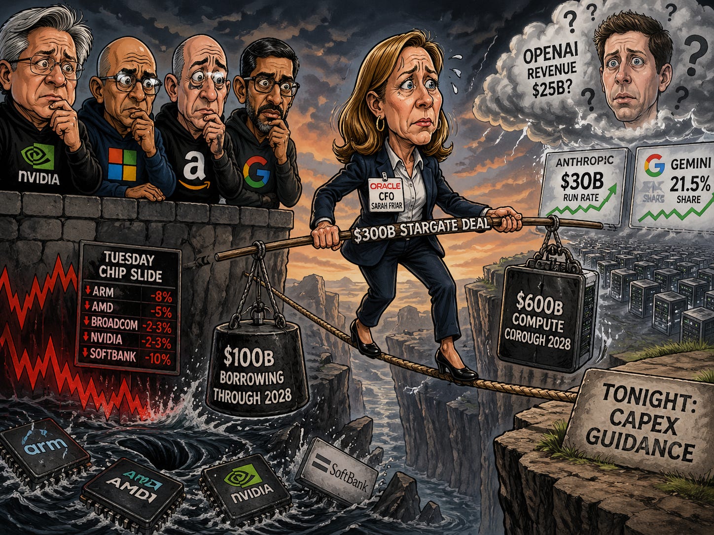 OpenAI's compute bill runs to roughly $600 billion, and reporting that Chief Financial Officer Sarah Friar privately questioned how to fund $600 billion in commitments triggered yesterday's selloff in semiconductors, neoclouds, and Oracle.