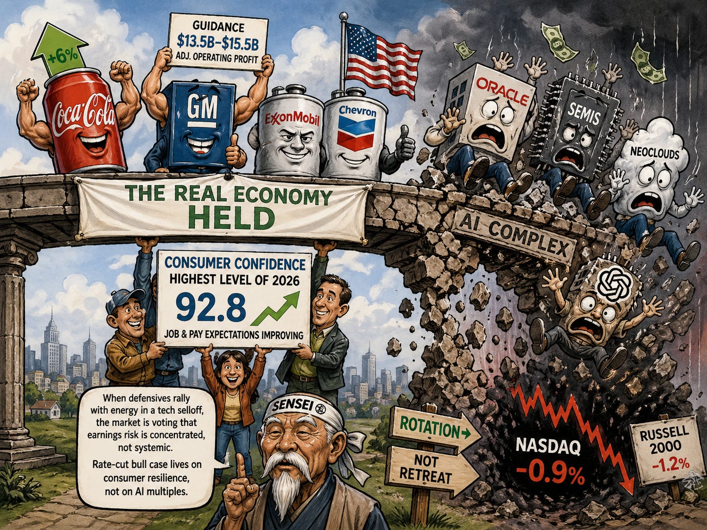 📊 Defensives Absorb the AI Selloff: Coca-Cola, General Motors, and energy held the tape as semiconductors cracked, signaling rotation not exit.
