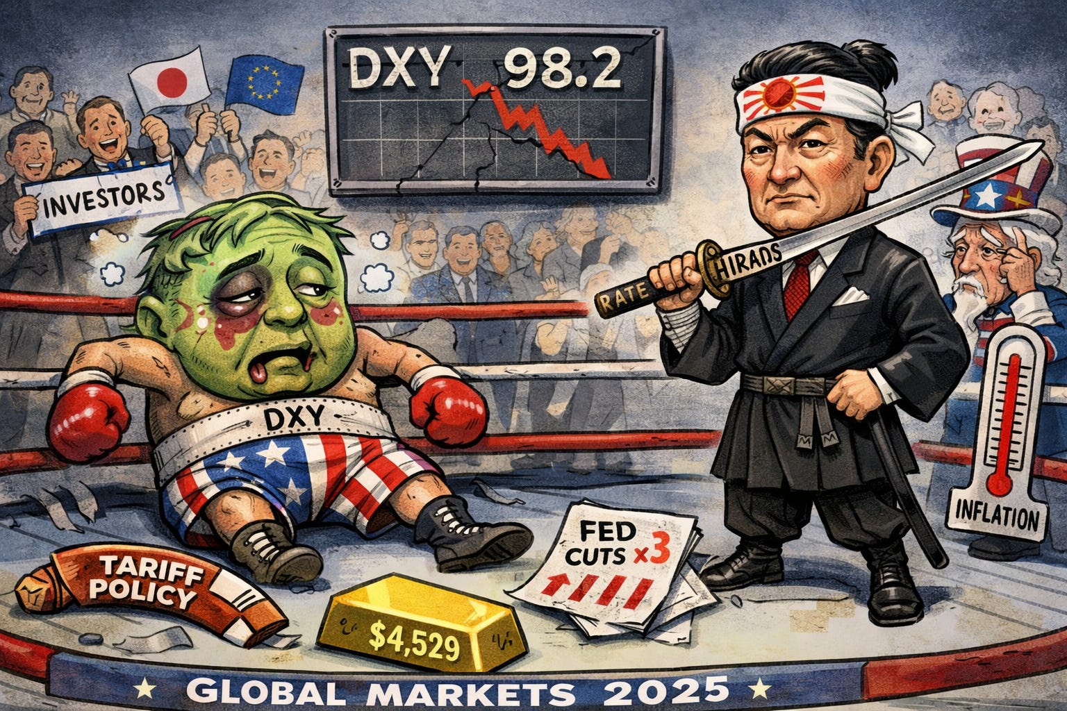 📉 Dollar’s Faceplant: The dollar logged its worst year since 2017 as rate cuts, tariffs, and narrowing yield gaps hit demand.