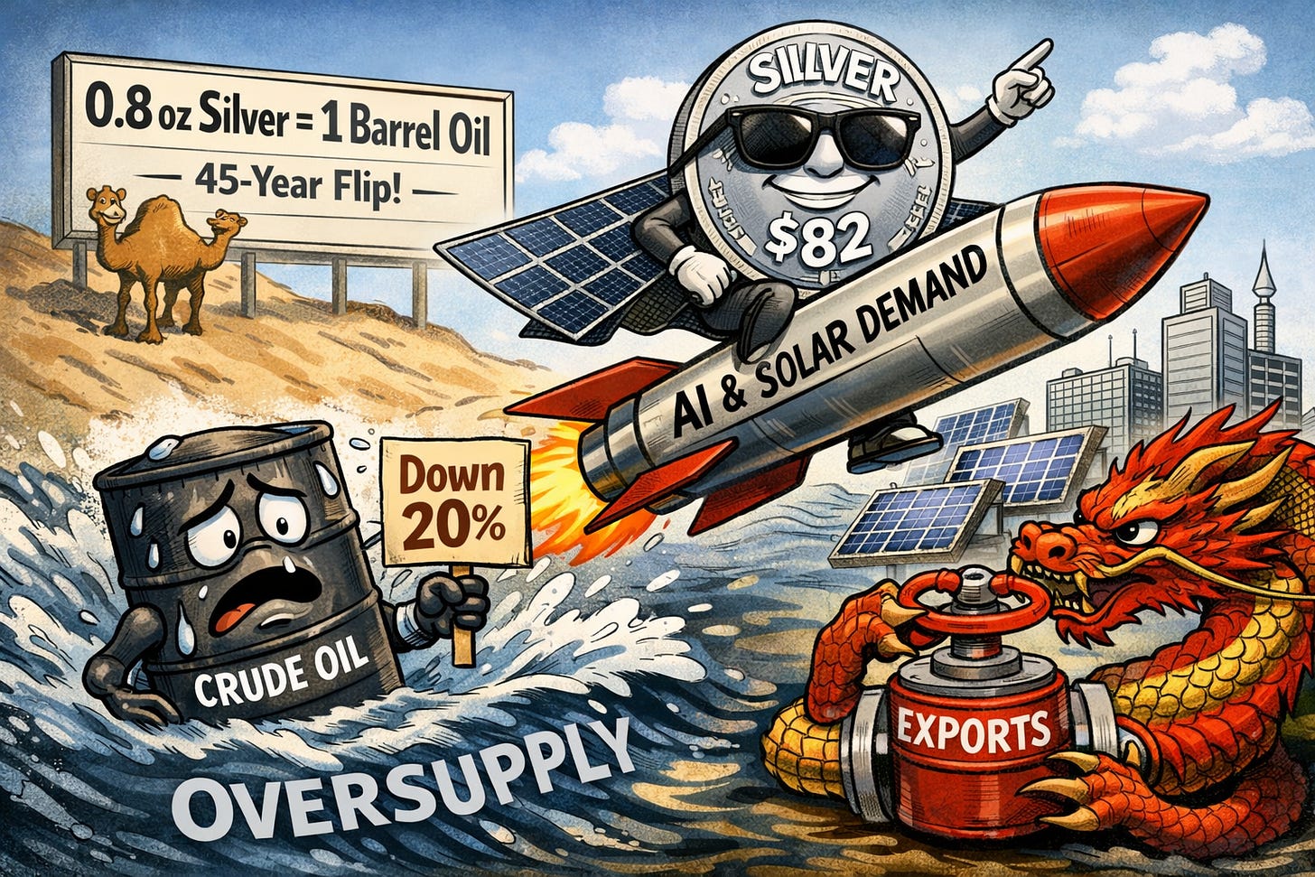 This divergence highlights two opposite extremes. Oil is drowning in a surplus that could hit 3.85 million barrels per day in 2026, especially if China slows its massive stockpiling campaign. Silver, however, is being squeezed by structural industrial demand from solar panels and AI data centers, paired with new Chinese export restrictions starting tomorrow. Retail investors should keep an eye on the 1980 Hunt brothers precedent. While the current demand is tied to real tech needs, the speed of this move suggests a speculative bubble. If historical norms return, either oil needs a shock upward or silver faces a heavy correction.
