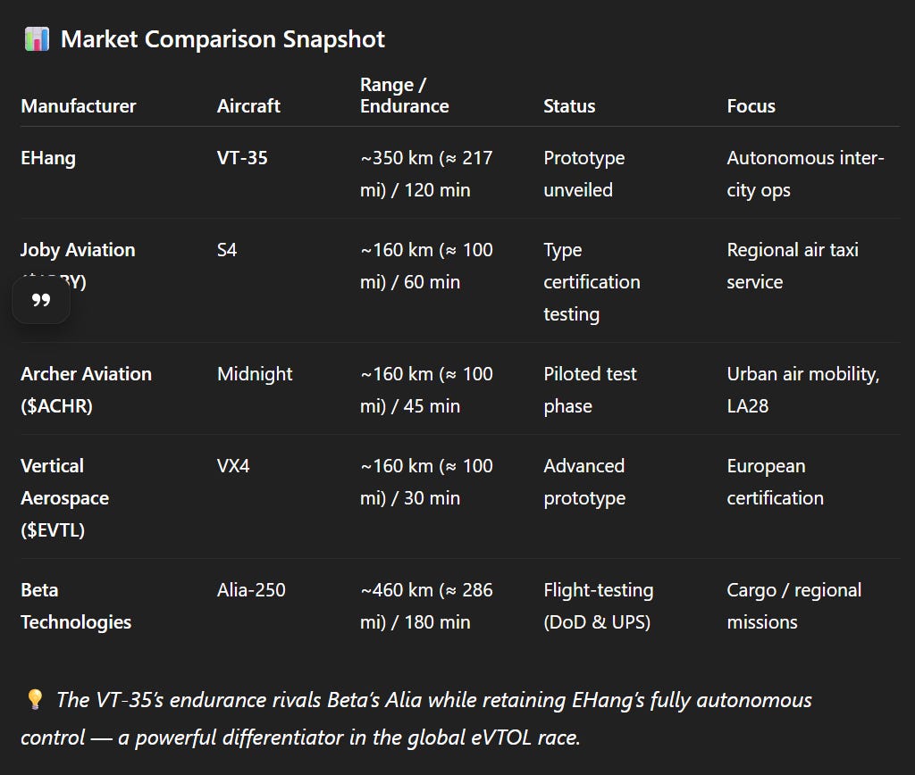 🔗 EHang described the VT-35 as “bridging the gap between cities and regions,” aligning with its roadmap toward a global AAM network.