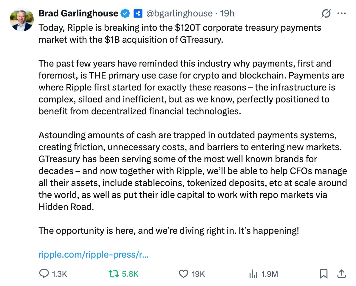 💼 Ripple Enters $120T Corporate Treasury Market With $1B GTreasury Bet