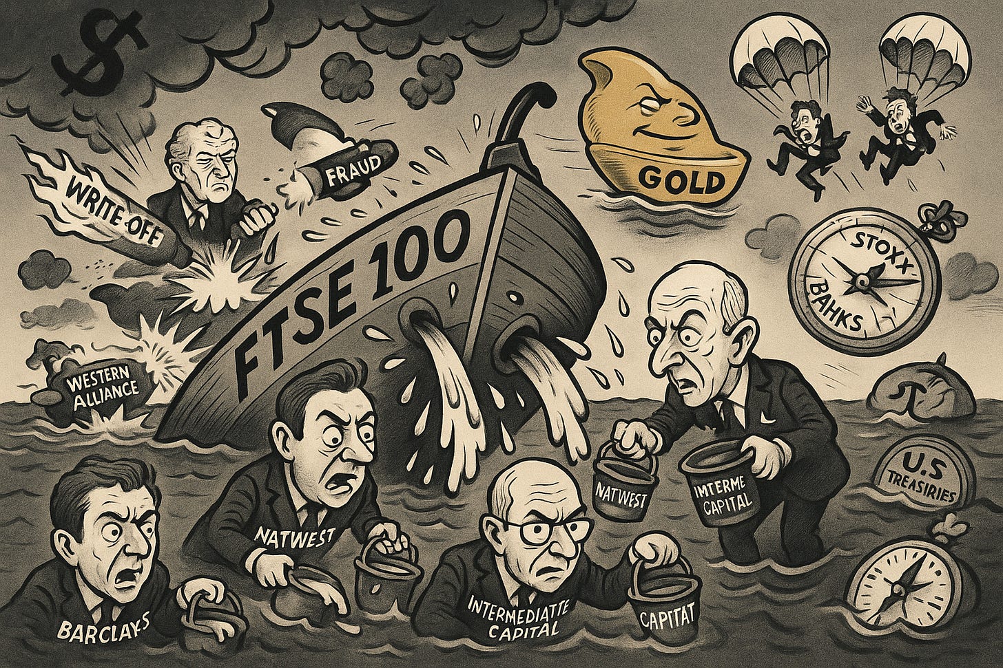 The FTSE 100 has fallen 2.5% over the past three sessions, marking its sharpest weekly decline since April’s tariff turmoil, as renewed concerns over U.S. regional lenders rippled through global markets (Bloomberg). Financial stocks led the slide, with Barclays down nearly 6%, NatWest off 3%, and Intermediate Capital Group dropping 7%, reflecting broader unease about credit quality and exposure to corporate loans (Evening Standard). The selloff was triggered by disappointing updates from U.S. regionals — Zions Bancorp disclosed a $50 million write-off tied to commercial real estate loans, while Western Alliance filed a fraud-related lawsuit against a defaulting borrower (Financial Times). The KBW Regional Bank Index plunged 6.3%, its worst performance since the 2023 banking crisis, reigniting fears of broader loan stress. Safe-haven demand surged, with gold topping $4,360/oz and U.S. 10-year Treasury yields sliding toward 3.4% (AP News).