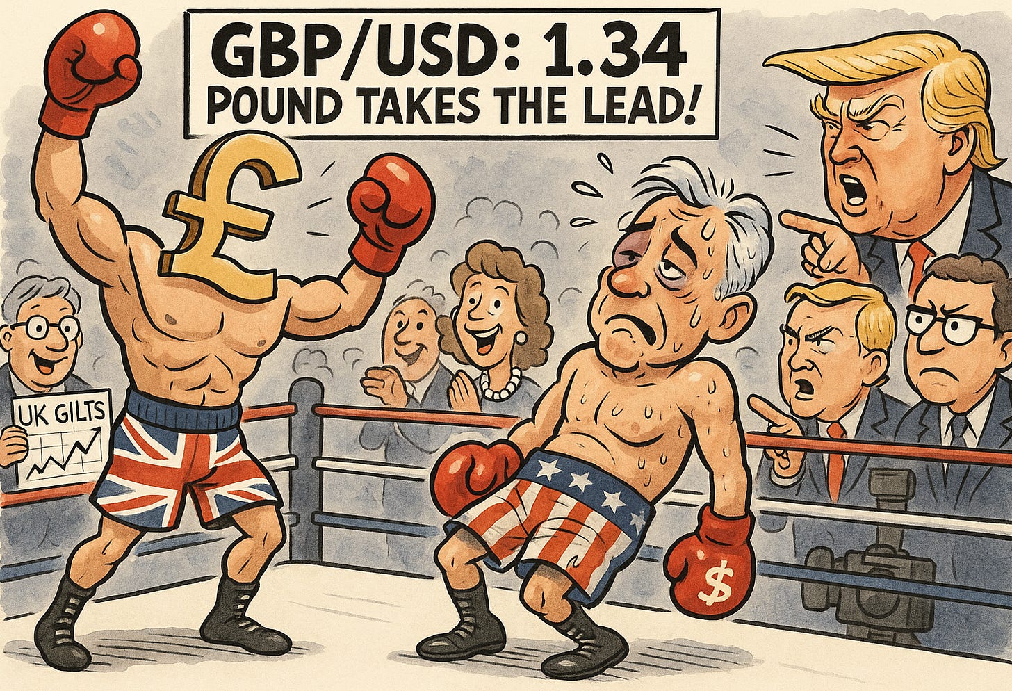 The British pound climbed above 1.34 against the US dollar on Monday as dollar weakness dominated global currency markets, fueled by ongoing trade tensions and uncertainty around Federal Reserve policy (Reuters, Investing.com). The greenback retreated after President Trump renewed criticism of Fed Chair Jerome Powell, sparking concerns over the Fed’s independence and future rate decisions (TorFX). UK gilts advanced, with the 10-year yield falling to 4.65% from near 4.67%, while 5-year yields eased to 4.08% (Trading Economics, Trading Economics). The FTSE 100 hovered near the 9,000 level, up 0.1%, as mining stocks gained on Chinese infrastructure spending plans (YouInvest, Independent).