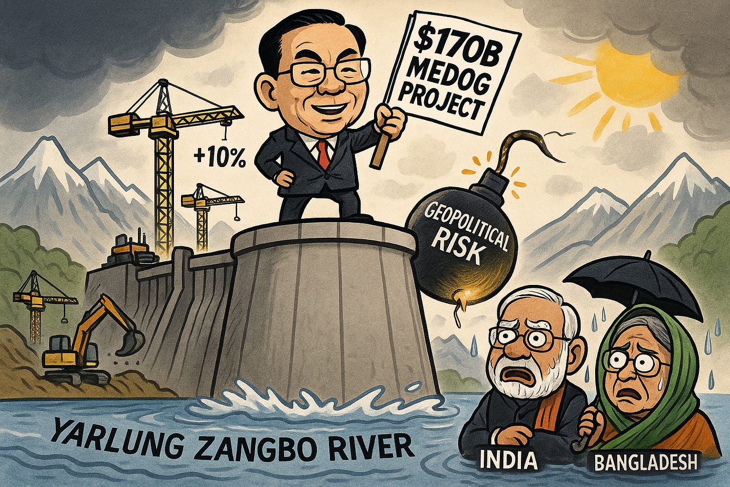 The announcement sent China’s construction stocks soaring, with the CSI Construction & Engineering Index jumping 4% to a seven-month high. Shares of Power Construction Corporation of China (601669.SS) and Arcplus Group (600629.SS) surged by their 10% daily limit, while cement maker Xizang Tianlu (600326.SS) and Tibet GaoZheng Explosive Co (002827.SZ) also hit their maximum 10% limit (Pakistan Today). Tunnel equipment firm Hunan Wuxin Tunnel gained 30%, reflecting market optimism about rising construction material demand (EconoTimes). However, the project is drawing international scrutiny, with India and Bangladesh voicing strong concerns over potential downstream impacts. Officials warn the dam could act as a “water bomb” in conflict scenarios (Hindustan Times). The location at the Great Bend offers immense hydropower potential but faces significant seismic and engineering risks (BBC).