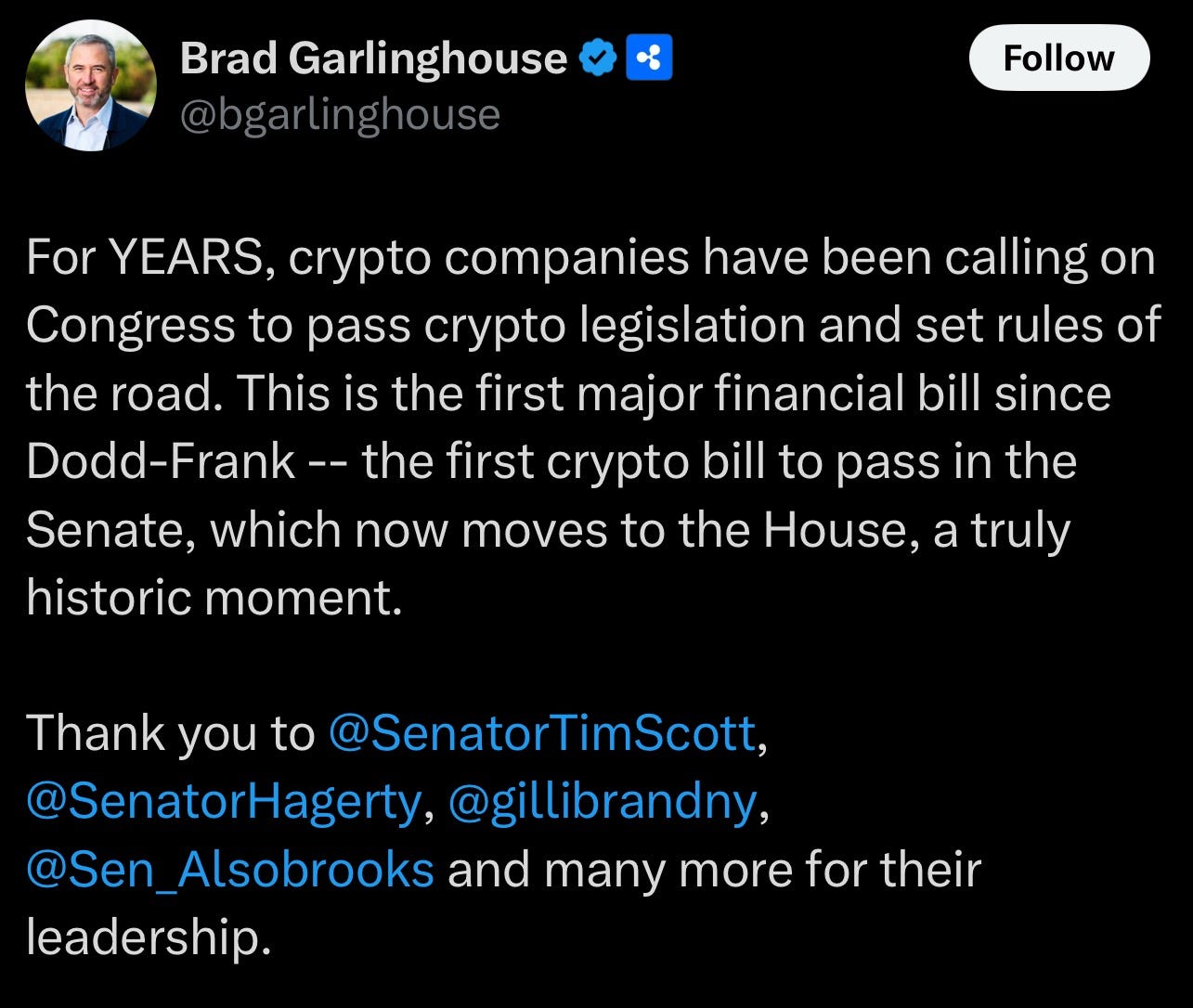 Ripple CEO Brad Garlinghouse called the GENIUS Act a “truly historic moment” having previously noted that the crypto industry has long awaited legislative clarity (Cryptopolitan). He emphasized the bill as a major first step in creating enforceable rules, and thanked key senators for their leadership. With stablecoins accounting for 1% of the U.S. dollar supply and posting $27.6 trillion in 2024 transfer volume, the bill could usher in institutional adoption and mainstream usage—though issuers will face increased compliance costs and regulatory oversight (Coindesk, Reuters, CNBC).