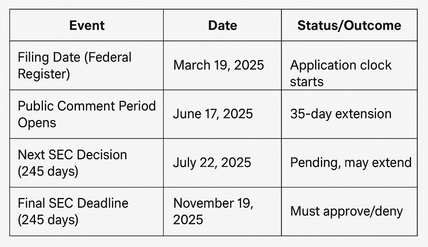 The U.S. Securities and Exchange Commission (SEC) has delayed its decision on Franklin Templeton’s proposed spot XRP ETF, formally opening the application to public comment as of June 17, 2025 (CryptoTimes, Cointelegraph). The next regulatory deadline for this ETF now falls in late July, following a 35-day extension from the latest SEC notice (CryptoTimes, Cointelegraph). Under standard SEC procedures, the agency can continue to extend its review, but must issue a final decision no later than November 19, 2025—245 days from the original filing date of March 19, 2025 (Cointelegraph, ICI). A similar extension and comment period has been applied to Franklin Templeton’s Solana ETF proposal, with both funds seeking listing on the Cboe BZX Exchange (CryptoTimes, Cointelegraph).