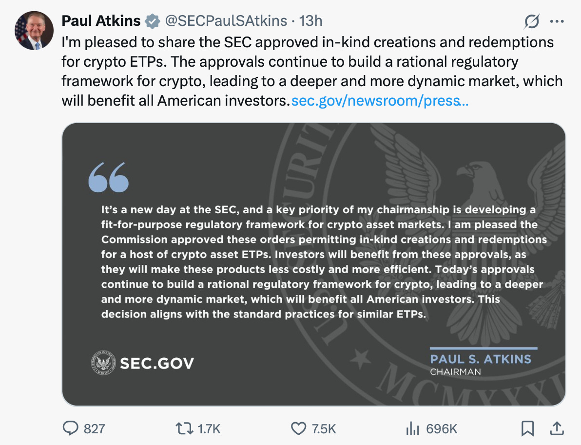 The regulatory change enhances ETF efficiency by reducing transaction costs, enabling tighter bid-ask spreads, and lowering tax exposure through in-kind transfers (TradingView, Mitrade). Crypto ETFs have already grown rapidly, with spot Bitcoin ETFs holding over $153 billion in assets under management as of July 28, led by BlackRock's IBIT at $86 billion (Wall Street Horizon, Techi). Chairman Atkins, confirmed in April, emphasized that this policy is part of a “rational regulatory framework for crypto” aimed at building a deeper and more dynamic market (SEC, Fortune). The decision signals broader institutional acceptance and could accelerate crypto ETF growth as operational hurdles are removed.