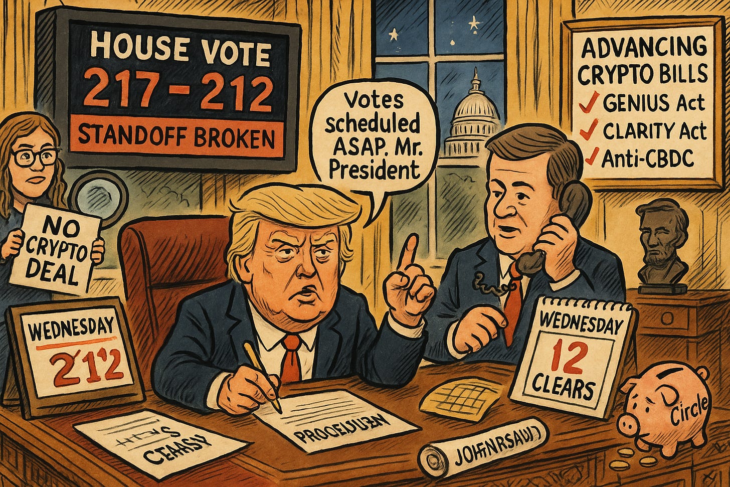 The House of Representatives late Wednesday night cleared a key procedural vote for three landmark cryptocurrency bills, including the GENIUS Act, after an unprecedented 10-hour session—the longest vote in House history (The Hill, Reuters). The 217-212 vote followed direct intervention from President Trump, who met with 11 of the 12 Republican holdouts in the Oval Office to resolve a two-day blockade (Politico, Forbes). Speaker Mike Johnson joined the meeting by phone and confirmed votes would be scheduled "as early as possible" (Politico).