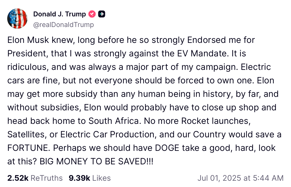 President Donald Trump reignited his feud with Elon Musk via a 5:44 a.m. ET Truth Social post on July 1, accusing Musk of benefiting from excessive government subsidies and calling on the Department of Government Efficiency (DOGE) to audit federal support to Musk’s ventures. Trump claimed that without these subsidies, Musk “could close up shop and head back home to South Africa,” slamming the Biden-era EV mandate and federal funding policies (Forbes; Newsweek). The DOGE reference, likely a jab at Musk’s crypto interests, came amid broader Republican efforts to scale back clean-energy tax credits (NPR).