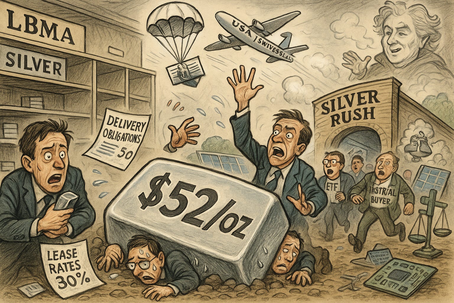 🪙 Silver Squeeze in London: Record silver prices surge past $52 as vault shortages trigger panic buying and market dislocation.
