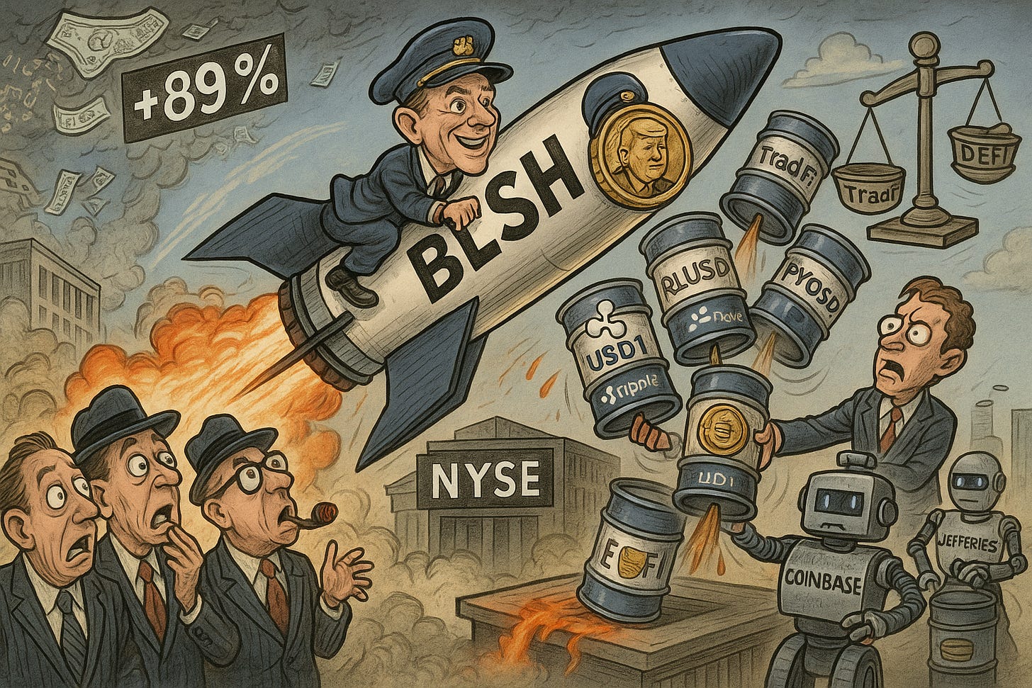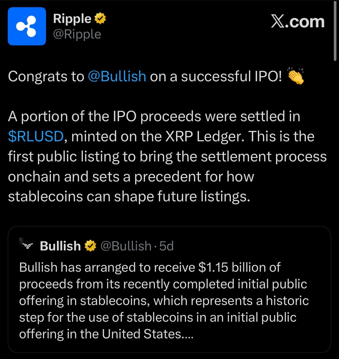 Bullish (NYSE: BLSH) jumped 11% to $69.80 on Thursday, extending its surge following a historic IPO that marked the first-ever U.S. public offering settled entirely in stablecoins. The crypto exchange operator has soared 89% from its $37 debut on August 13, reaching a market cap over $10 billion amid intense trading volatility that prompted multiple halts (CNBC, Reuters). IPO proceeds of $1.15 billion were received in a diversified mix of stablecoins: Ripple’s RLUSD (on the XRP Ledger), Circle’s USDC and EURC, PayPal’s PYUSD, and USD1—a token linked to Donald Trump—with most minted on Solana. Jefferies coordinated the groundbreaking settlement logistics while Coinbase provided asset custody.